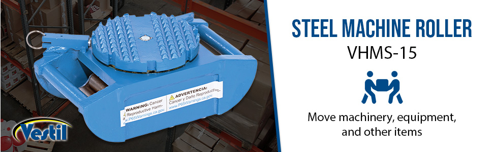 Made of high-strength annealed ductile iron, these Steel Machine Rollers have swivel tops that rotate 360 degrees on chrome steel ball bearings to allow for easier turning. The rollers form a "tank track" to revolve around a center load bearing plate in the frame to provide maximum maneuverability. The weight of the load is transferred directly from the load bearing plate to the rollers, eliminating axle friction and requiring less power to start and move. A spring loaded locking mechanism on the swivel tops, except on model VHMS-2, can be engaged in detents at 45 degrees intervals. These units are virtually maintenance free. Steering bars split in two and connect with sleeve for easy storage.