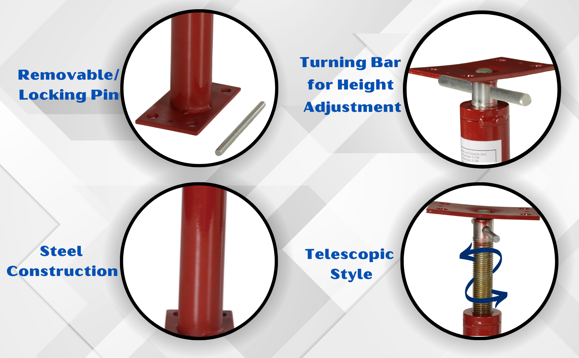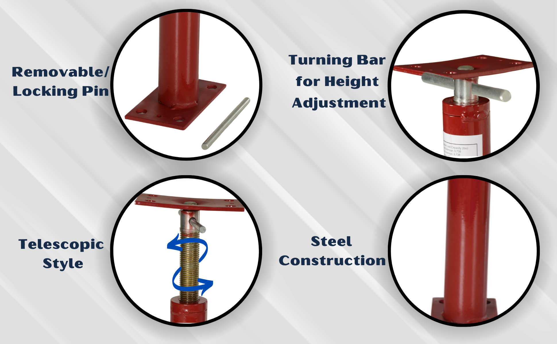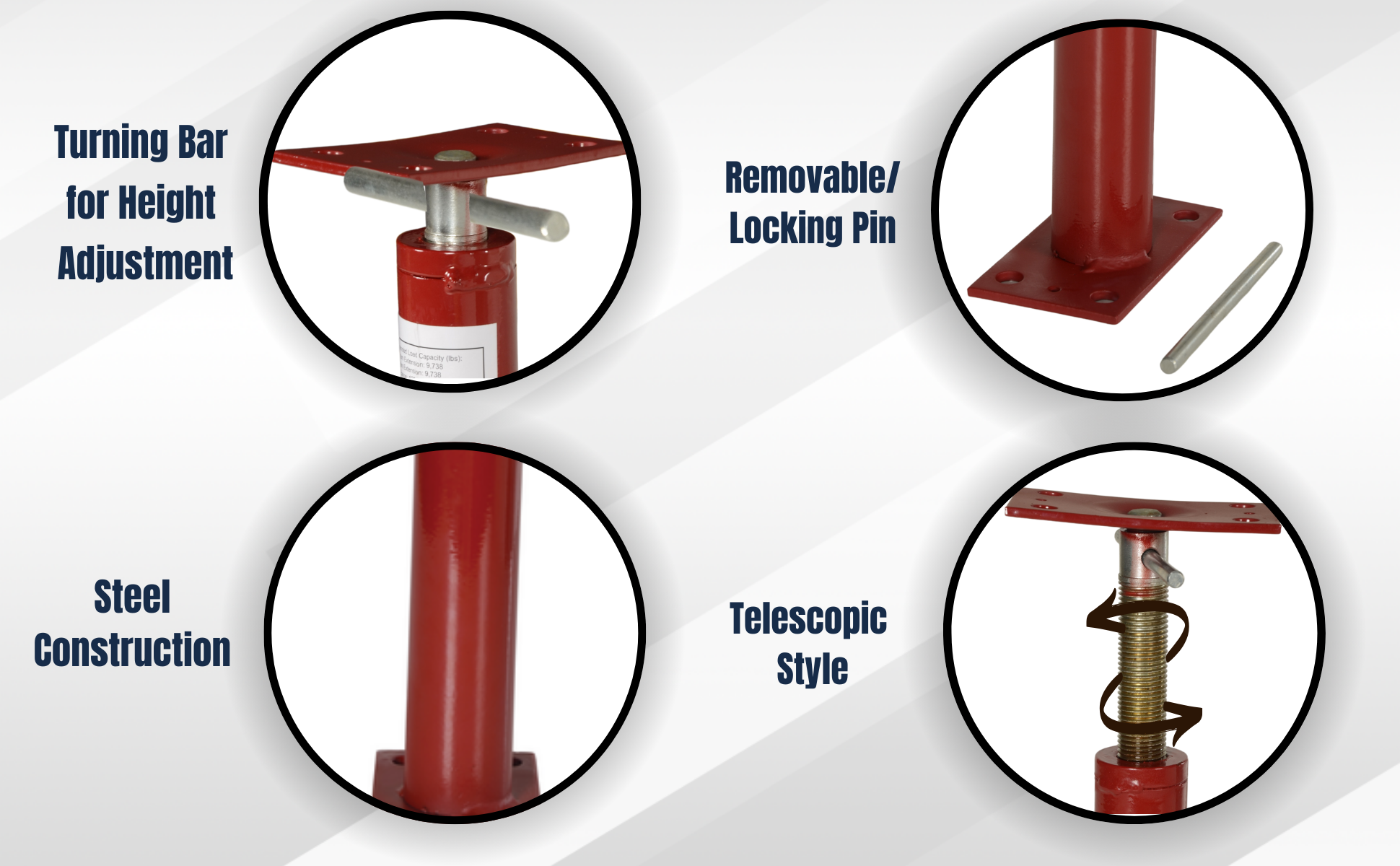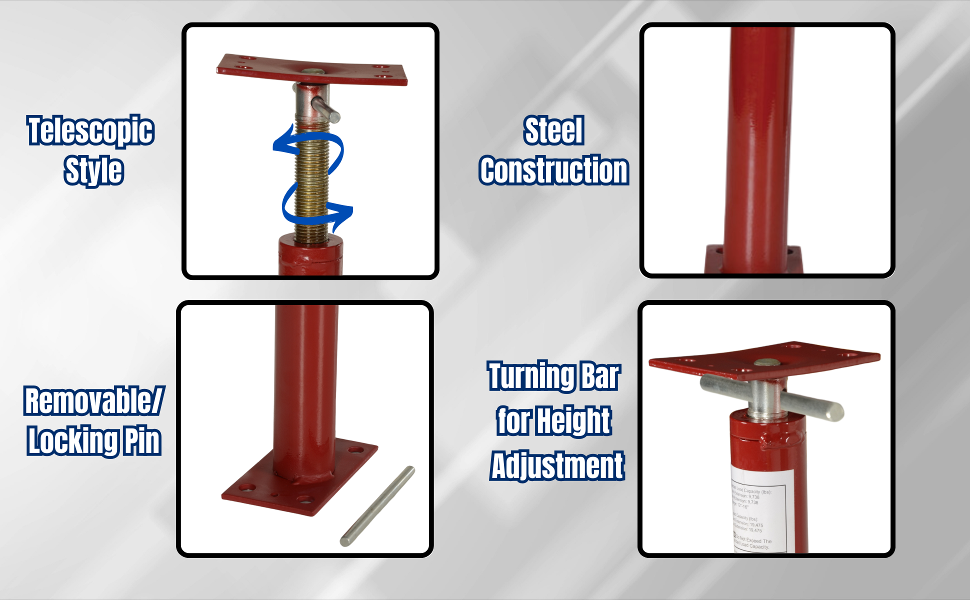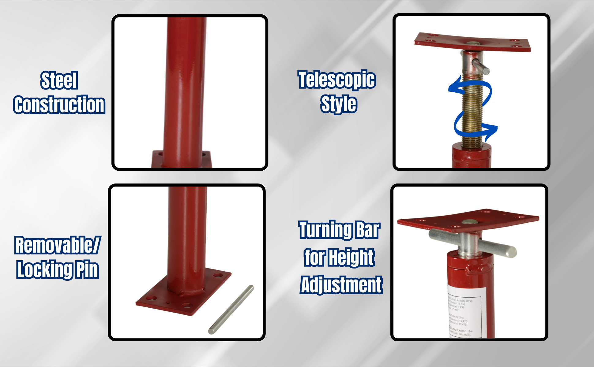 FJB-48Provide extra support for leveling and stabilizing floor beams and joists during construction and repairs. Telescopic style with removable pins lets you properly position the brace for better leveling. Includes turning bar for easy height adjustment. Rugged all welded steel construction. Red oxide finish.