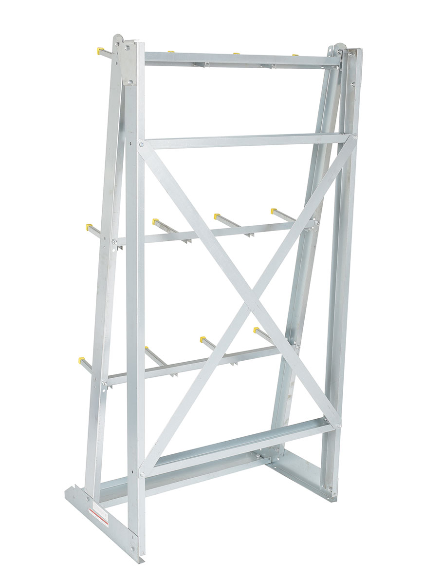 Model SR-SS is a self-supporting 66" high A-frame with 7 storage levels. Arms extend up to 12" beyond A-frame. Base dimensions are 60" by 36". Rack must be statically and uniformly loaded. Capacity for each side equals half the total system capacity. Each support arm must also be statically and uniformly loaded. Shipped knocked down with convenient and quick assembly. Bright zinc plated finish.