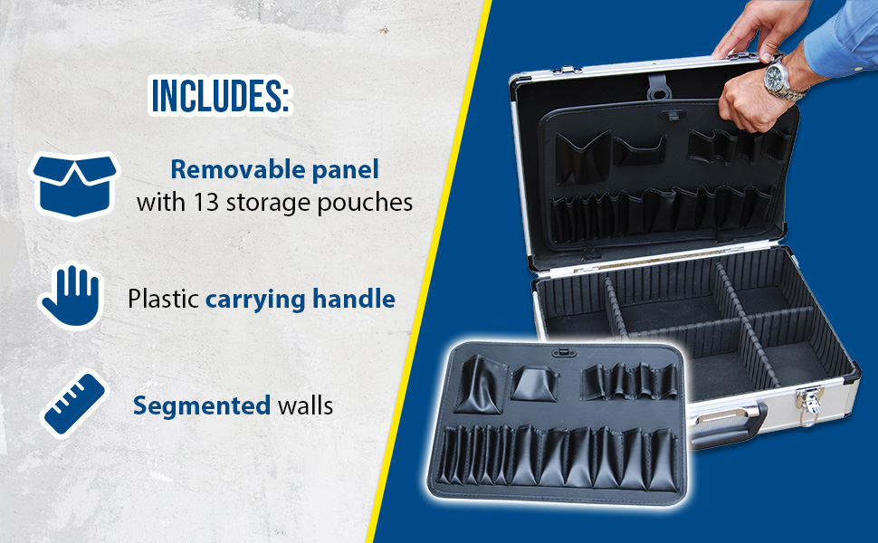 CASE-1814 CASE-1814Aluminum Carrying Case 18 In. x 14 In. SilverStorage Pouches (qty.): 13