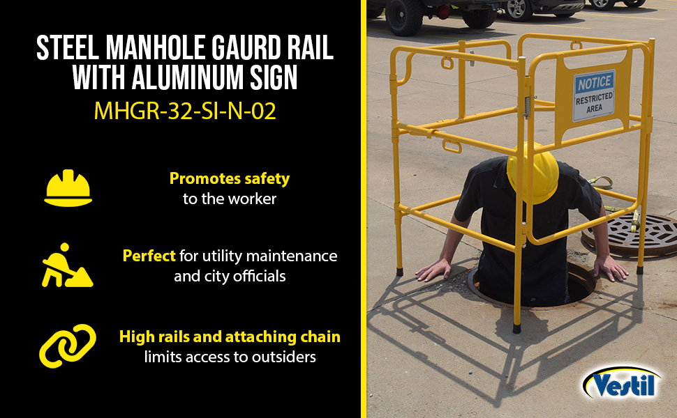 MHGR-32-SI-N-02 MHGR-32-SI-N-02Steel Manhole Guard Rail with Aluminum Sign 31 In. x 30 In. Notice Restricted Area Sign Message YellowUsable Width/Length (in.): 31 x 30