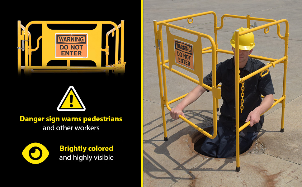 MHGR-32-SI-W-01 MHGR-32-SI-W-01Steel Manhole Guard Rail with Aluminum Sign 31 In. x 30 In. Warning Do Not Enter Sign Message YellowUsable Width/Length (in.): 31 x 30