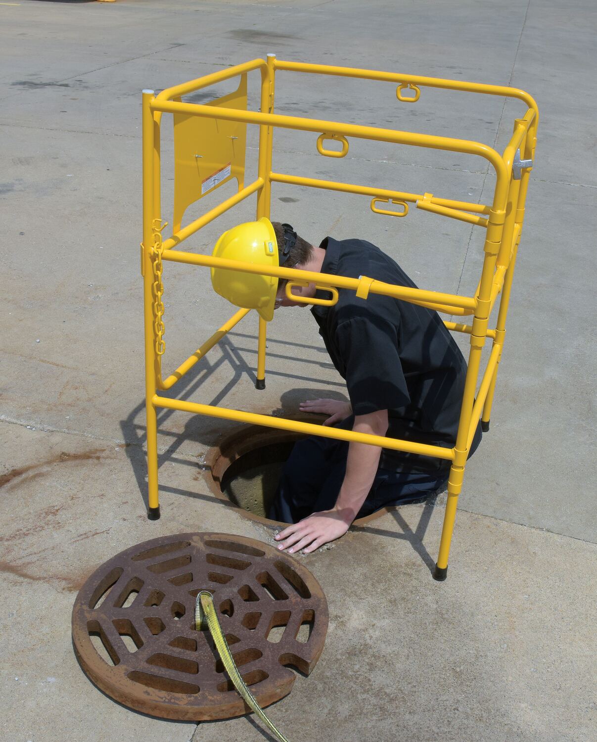 The manhole guard rail is perfect for utility maintenance and city officials. The simple set up and take down promotes quick use when on the go and a compact storage when not in use. High rails and an attaching chain limit access and promote safety to the worker in the enclosed area. A brightly colored high strength construction makes the unit highly visible, giving caution to pedestrians and other workers to keep their distance.