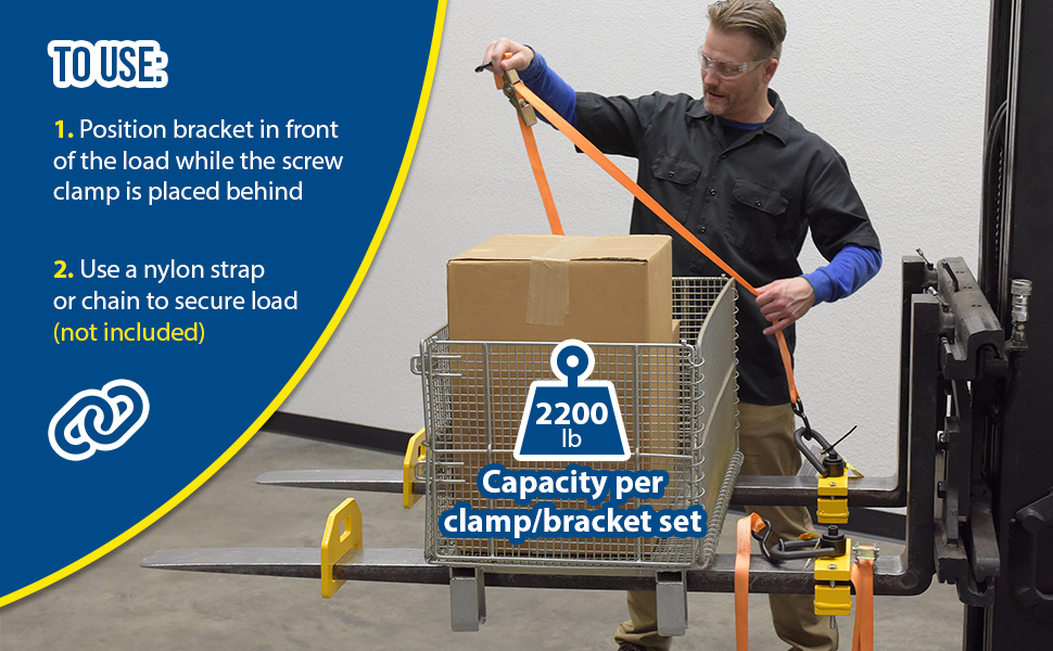 Forklift tie down clamps are a great asset when securing loads for transport. These are sold in pairs, so the entire unit is comprised of four pieces (2 brackets, 2 clamps). An eye bracket is positioned in front of the load while the screw clamp is placed behind the unit, closest to the forklift driver. These are put in place by sliding over the forks. Simply use the preferred type of tie down such as a nylon strap or chain to secure the load (chain and strap not included).