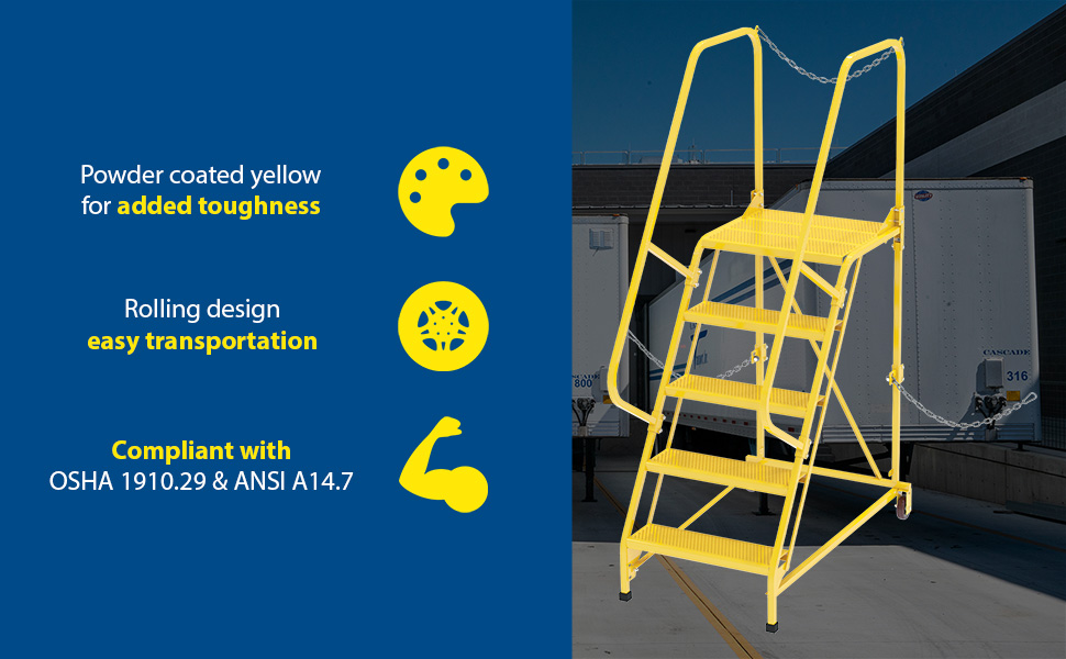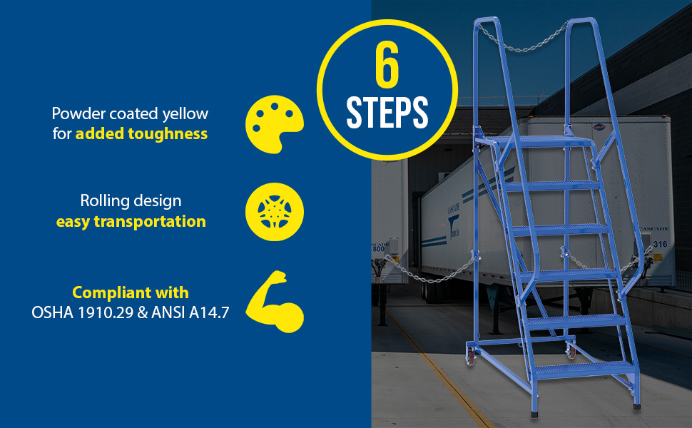 Semi-Trailer Access Ladders are for use getting into Semi-Trailers. Tilt the unit to allow for portability. Units roll on 4" poly-on-poly wheels. Constructed of square tubing framework which handles uniform capacities up to 350 lbs. Features 30" high removable hand railing, access chain, 21" deep top platform, and an industrial baked-in blue powder coat finish for toughness. Each step measures 24" wide by 7" deep and is spaced 10" apart. Climb Angle is 58 degrees. |