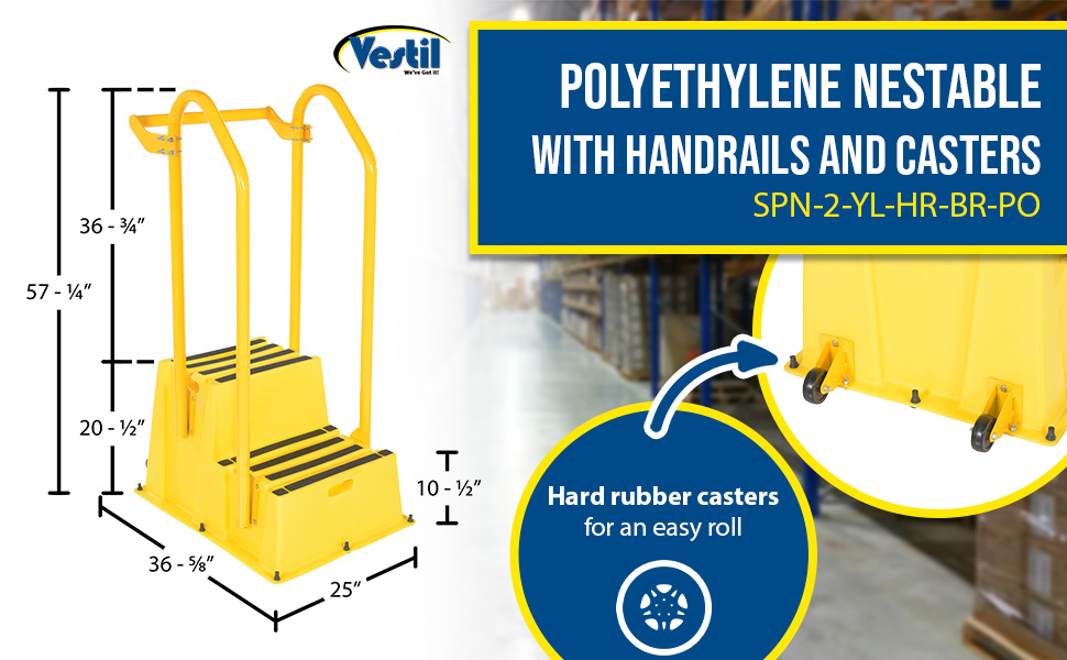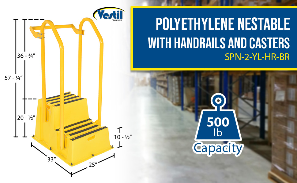 SPN-2-YL-HR-PO SPN-2-YL-HR-POPolyethylene Nestable with Handrails Casters 2 Step 500 Lb. Capacity YellowUniform Capacity (lb.): 500