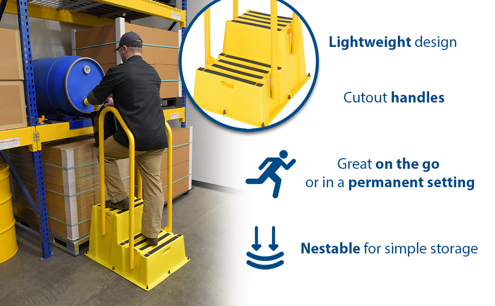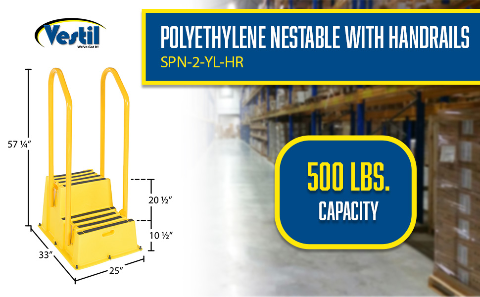 SPN-2-YL-HR SPN-2-YL-HRPolyethylene Nestable with Handrails 2 Step 500 Lb. Capacity YellowUniform Capacity (lb.): 500