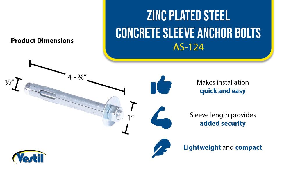 AS-124-12PK AS-124-12PKSteel Concrete Sleeve Anchor Bolts 12 Pack 1/2 In. x 4 In. SilverPack (qty.): 12