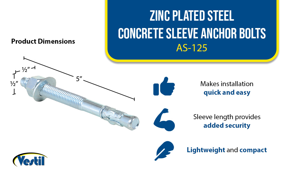 AS-125-12PK AS-125-12PKSteel Concrete Sleeve Anchor Bolts 12 Pack 1/2 In. x 5 In. SilverPack (qty.): 12