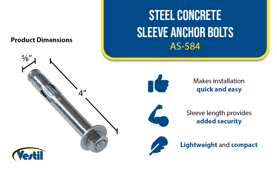 AS-584-12PK AS-584-12PKSteel Concrete Sleeve Anchor Bolts 12 Pack 5/8 In. x 4 In. SilverPieces in Package (qty.): 12