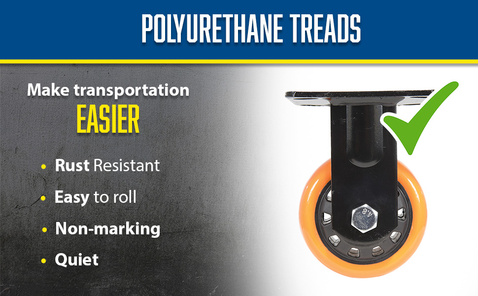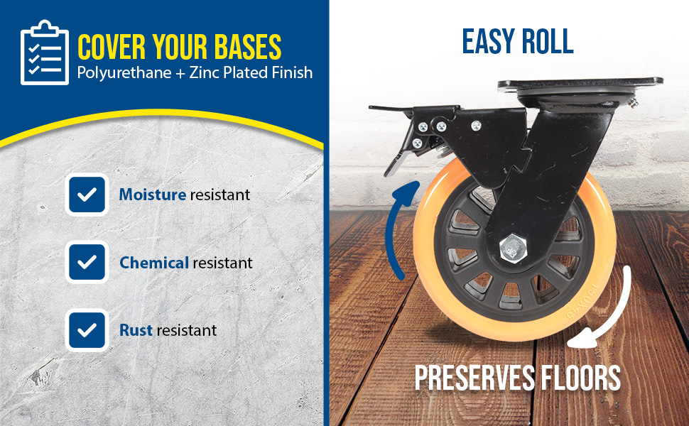 Polyurethane is ideal for most environments. It is resistant to a variety of chemicals, and produces an easy roll for ergonomic applications. It also provides good floor preservation and works effectively in both indoor and outdoor environments. The unique spoke design allows for a lighter weight caster with the same amount of capacity.