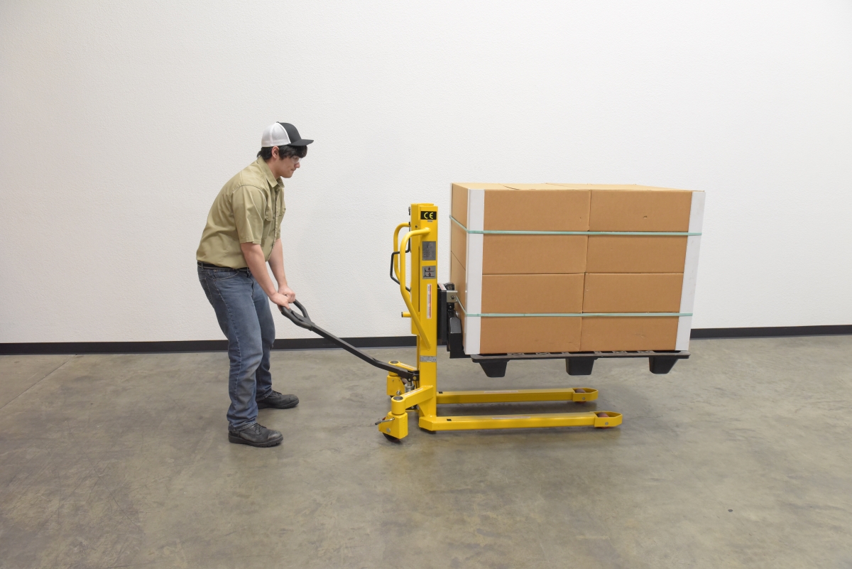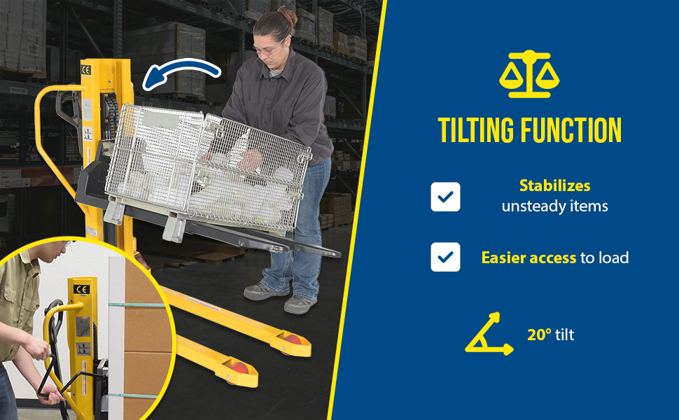 A Lift and Tilt pallet truck is an outstanding addition to a variety of production environments. The hand pump lever functionality gives the user control over the precise height movements of the forks. With a wide service range, items both large and small can be loaded and unloaded at a height that best fits the users preference. For items that may need added stability, the tilting function is available. The tilting function can be used up to 20 degrees tilt for extra steadiness. Steel construction with a powdercoat finish for added baked in toughness.
