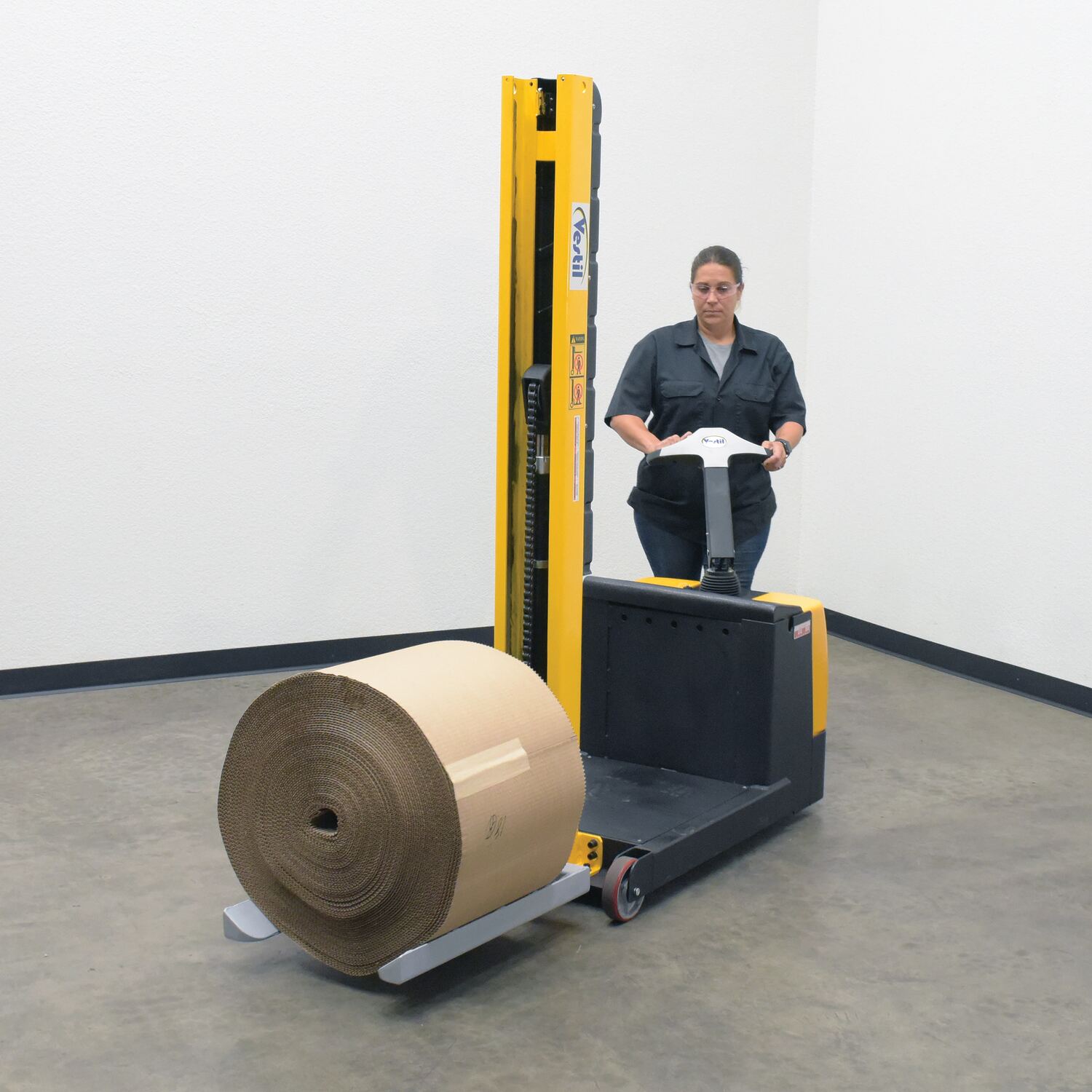Counter balance stacker with a narrow mast design is ideal for die loading, machine feeding, and for loading and unloading trucks in confined areas. An ergonomic handle features easy-to-operate throttle with infinite adjustment of forward and reverse speeds, lift/lower controls, and emergency reverse function. Multiple attachments available. Includes an automatic dead-man feature that activates when the user releases the handle. Also included are batteries, an integral battery charger, and battery level gauge. Easy access battery compartment simplifies battery maintenance.
