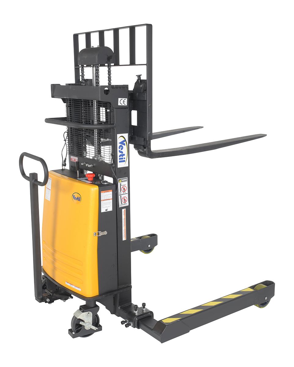Semi-Electric Stackers are designed for fast, reliable lifting and lowering. Built from high-quality materials, these units include adjustable forks and support legs that accommodate various pallets and skids. With a powered lift and a manual push design, each stacker can be maneuvered easily between areas suing the standard pull handle. Each standard unit included a 12V power system with a integral battery charger and battery gauge.