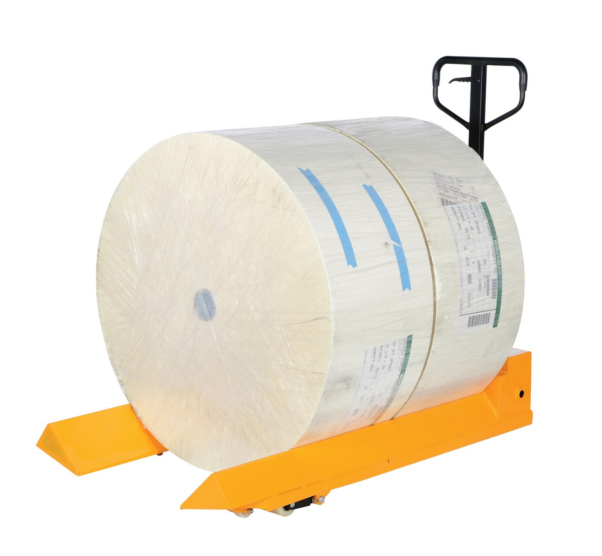 Transport rolls of material with standard pallet trucks. Sloped ends allow for manually rolling material into position. V-shaped center holds rolls in position. Steering wheels measure 7" x 2" while the load rollers are 3-1/2" x 3".