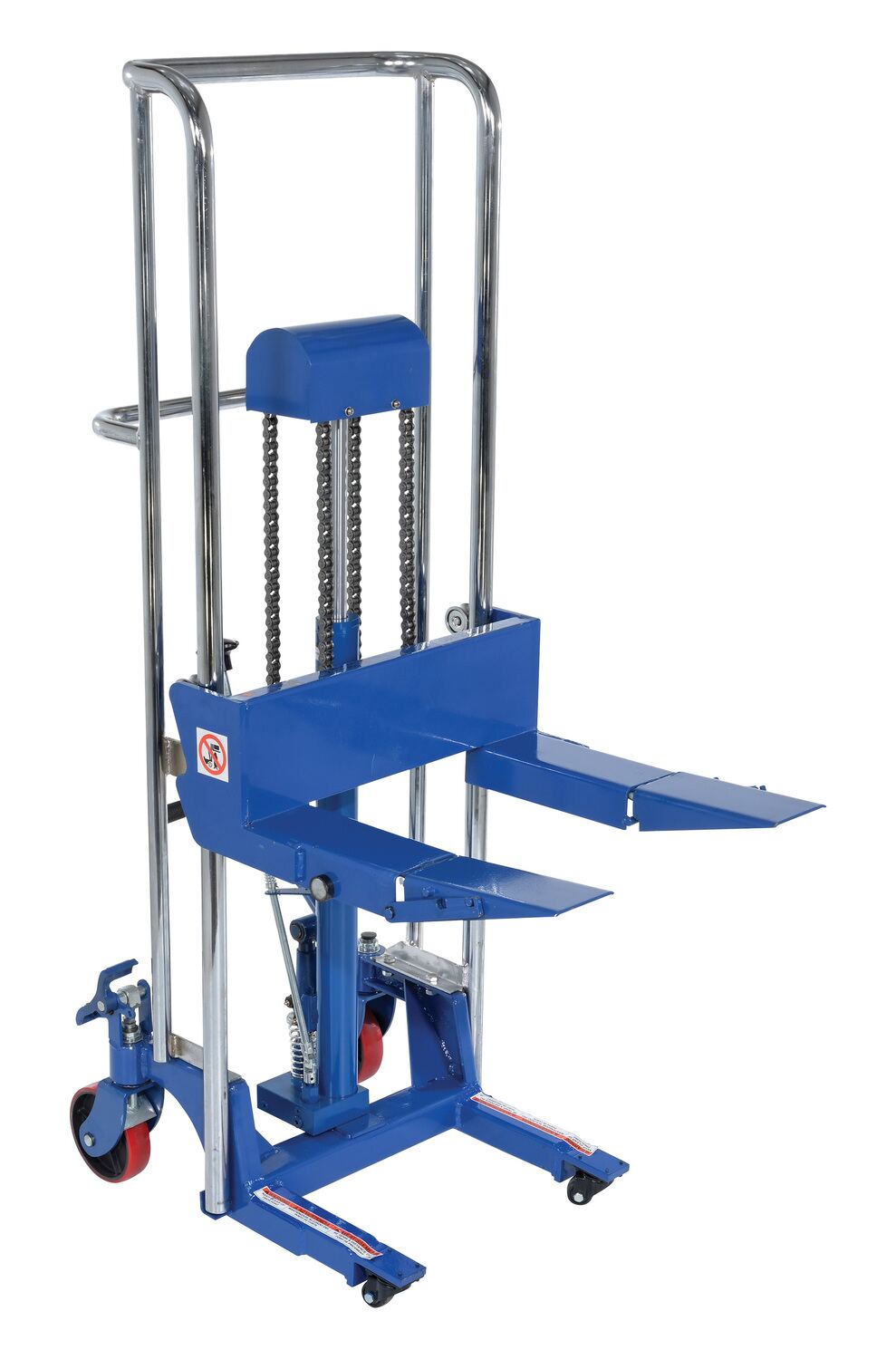 A compact roll lifter provides an efficient approach to loading and unloading large, heavy rolls. Simply designed, the cradle is lifted and lowered by use of the hydraulic foot pedal. For safe loading and unloading of rolls, ramps are attached to the front of the cradle to assist the user. The ramps can be placed upright to lock the product into position or can be unfolded to allow the release of the product. The narrow wheel base allows the lifter to be used in compact and crowded areas. Constructed of steel with a blue powder coat finish.