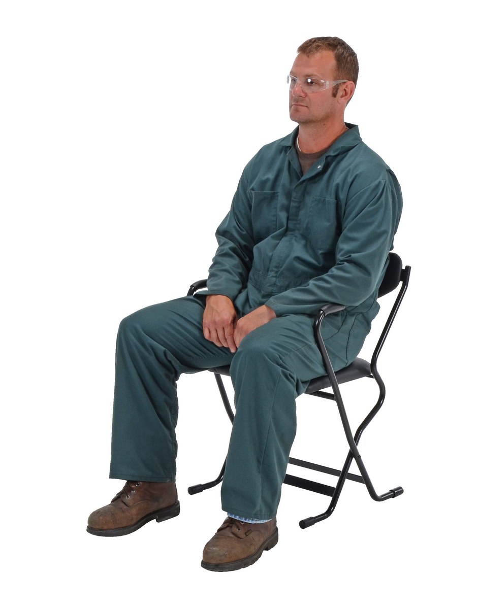 The folding arm chair is ideal for a variety of industrial environments. The lightweight steel construction with a powder coat finish is durable and easily moved from area to area. The unique folding design features an integral arm support system that offers assistance while transitioning from a sitting to standing position. To fold, simply push the front of the seat up and back, while the unit collapses onto itself. The unit includes vinyl cushioning for comfort, plastic caps on the steel legs to protect against floor damage, and is self-standing when folded for areas of limited storage space. Color is black.