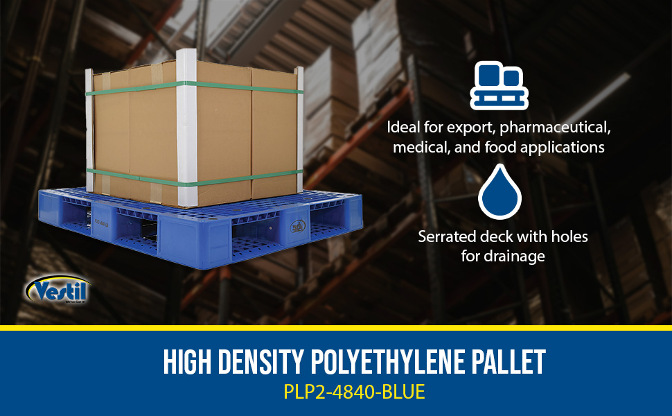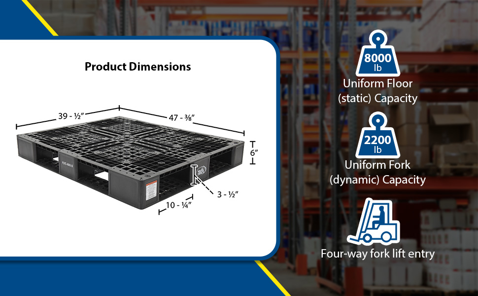 PLP2-4840-BLUE PLP2-4840-BLUEHigh Density Polyethylene Pallet 39-3/8 In. x 47-3/8 In. x 6 In. 8000 Lb. Capacity BlueUniform Floor (static) Capacity (lb.): 8,000