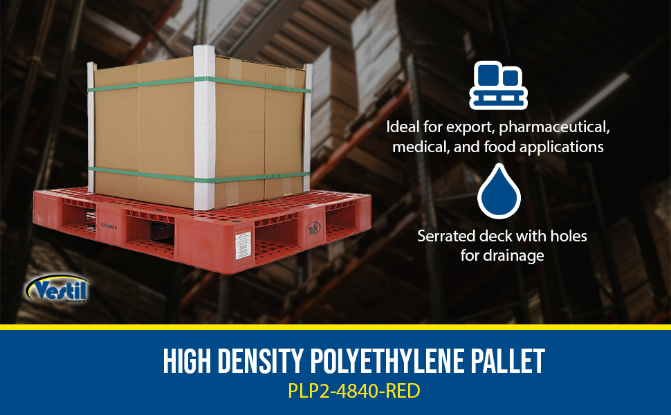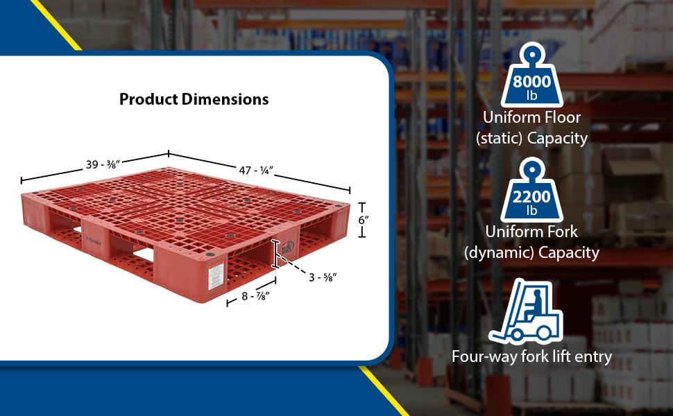 PLP2-4840-RED PLP2-4840-REDHigh Density Polyethylene Pallet 39-1/2 In. x 47-3/8 In. x 6 In. 8000 Lb. Capacity RedUniform Floor (static) Capacity (lb.): 8000