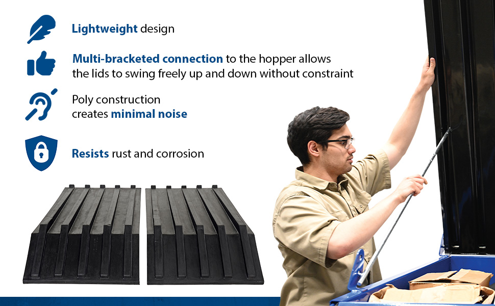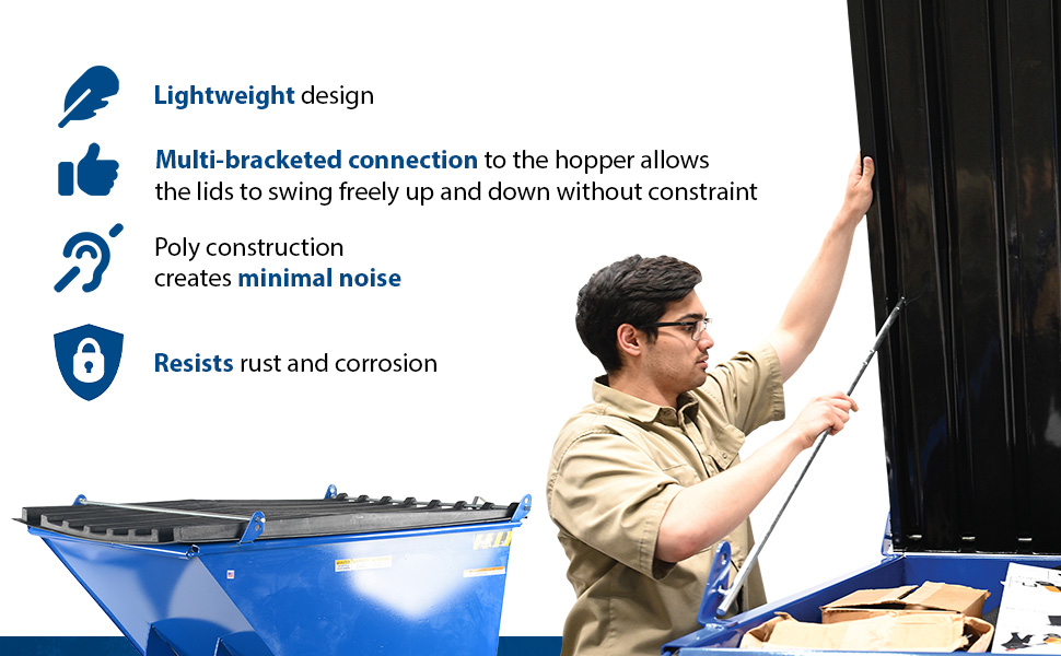 Keep the contents of hoppers out of sight for a cleaner appearance with our Poly Lids. Constructed from heavy-duty virgin polyethylene material, these lids are lightweight and easy to open. The top of the lid includes a crown for water drainage and a ribbed design for strength and aesthetics. Not compatible with LUG option. Ideal for schools, hospitals, and warehouses.