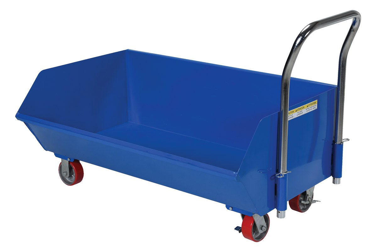 Low profile design (top chute only 22" high) allows for use under machinery and conveyors. Tapered side allows for easy loading and unloading. Designed for containment of scrap, chips and waste. Constructed of welded 14-gauge steel for strength and lighter weight. Unit rolls smoothly on (2) rigid and (2) swivel with brakes 5" x 2" poly-on-steel casters. Push handle is removable and may be used at either end. Blue baked-in powder coat finish for added toughness.Options, including welded leak proof seams, model LEKP, 3/4" drainage plug, model H-DPLG-75, and 2" drain plug model H-DPLG-2, leak proof seams included with drainage plugs, available.