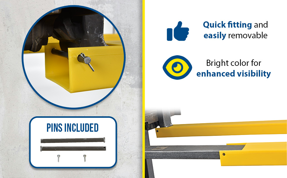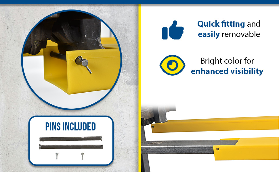Prevent damage to packages and skids from sharp edges of fork truck forks with blunt end Fork Blade Protectors. Hide unsightly scratches and gouges on your forks as well. Constructed from lightweight 100% polyethylene material. Simply slide over forks. Held in place with a clevis pin and cotter pin.