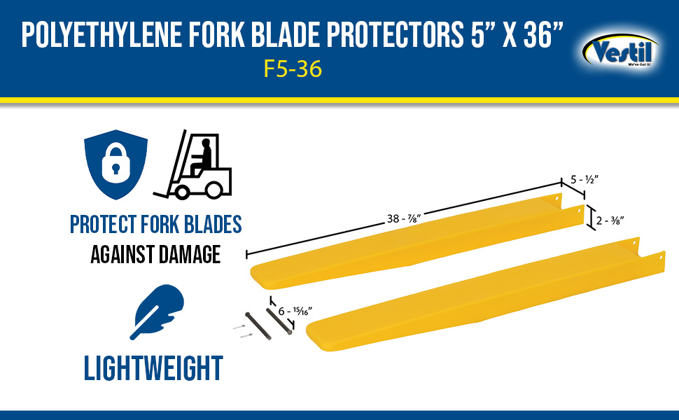 F5-36 F5-36Polyethylene Fork Blade Protectors 5 In. x 36 In. YellowUse with Fork Blades Width/Length/Height (in.): 5 x 36 x 2