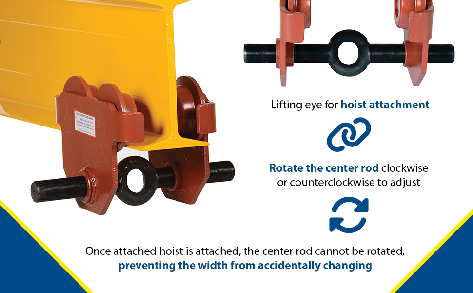 These trollies have been designed to quickly install on virtually any S, H,W, and M type I-beam. The width of the trolley is adjusted by rotating the center rod with lifting eye clockwise or counterclockwise. Once hoist (not included) is attached, center rod cannot be rotated which prevents trolley width from accidentally changing. Choose either push trolley or geared trolley. Geared trolley is ideal for use when precise positioning of the trolley is required. The trolley includes four rollers with sealed bearings for long life. A lifting eye is located at the bottom of the trolley for attaching a hoist (not included). Steel construction and painted finish. Headroom is measured from the bottom of wheel to bottom of hooking eye.
