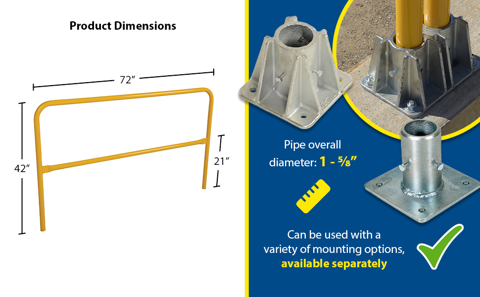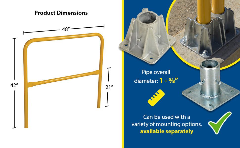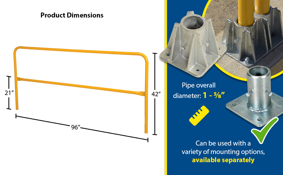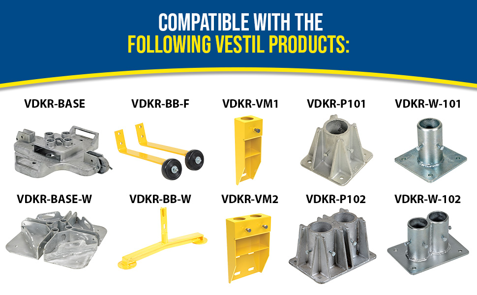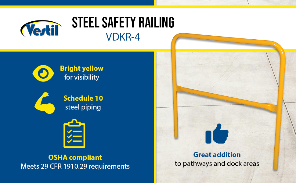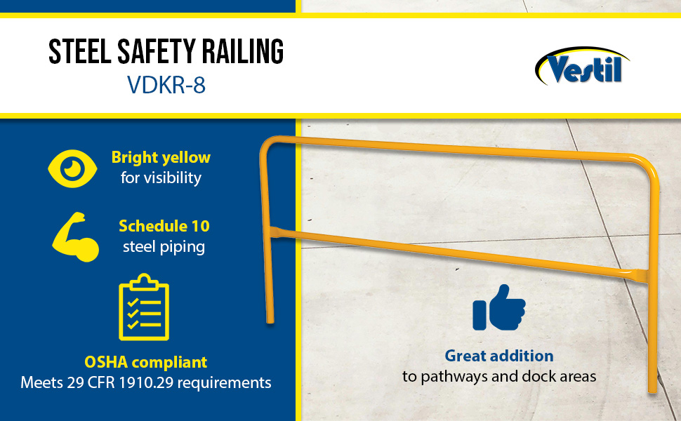 Protect people from uneven walkways and mezzanine drop-off's. The safety railing is constructed of schedule 10 steel. All models have an outside pipe diameter of 1-5/8". Handrails are 42" high with a 21" mid-rail. Mounting options include socket sleeves, cast steel base, barricade base, or cast steel sockets for convenient handrail removal. The cast steel sockets accept wood 2" x 4" or 2" x 6" when toe boards are required. Two (2) lag down holes are pre-drilled for permanently mounting the railing. The steel design includes a baked-in powder-coated finish, which is available in a variety of colors found in the table below. The VDKR series safety rail products comply with U.S. Occupational Safety and Health Administration (OSHA) General Industry requirements for guardrail systems in 29 CFR 1910.29.