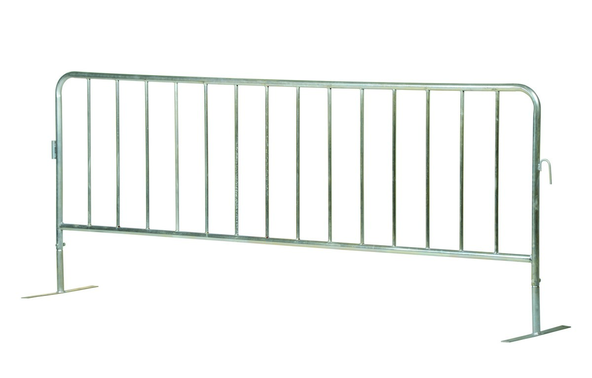 Attractive and functional design ideal for directing personnel. Interlocking portable railing has many commercial and industrial applications. Easy to move to meet changing needs. Upright bars are vertically spaced at 5-7/8" intervals for the light-weight barriers and 5-3/4" for the heavy-duty style. Each railing includes connectors to attach multiple units together to form long runs. Overall size is 102"L x 40"H. Feet are removable so railing will lay flat for shipping and storage. Variety of foot styles available. Rugged welded steel construction.