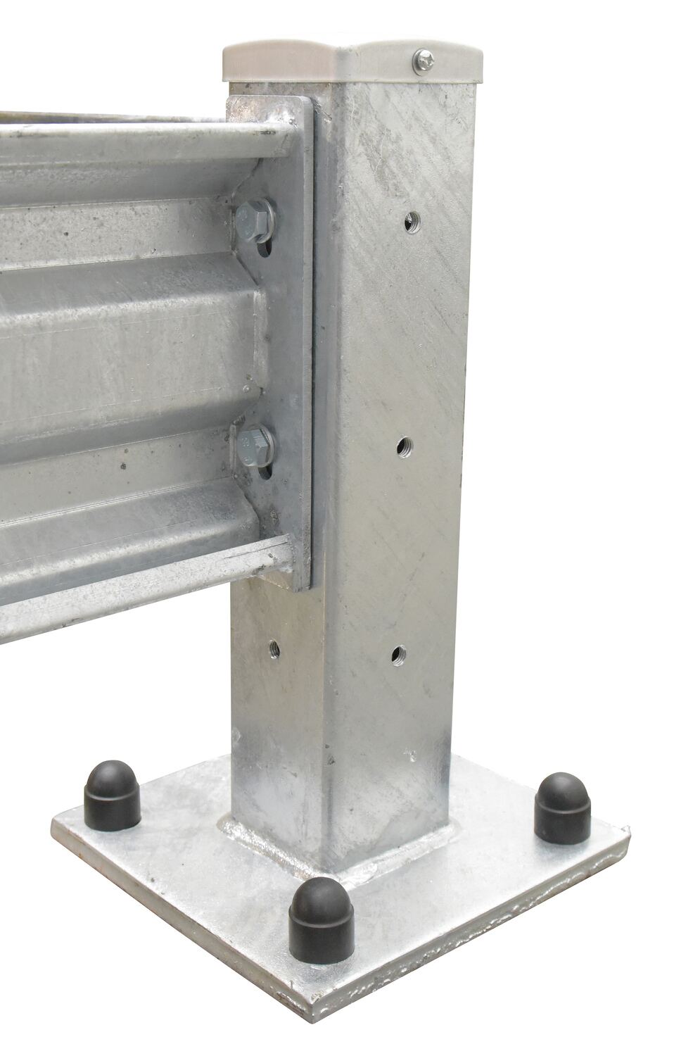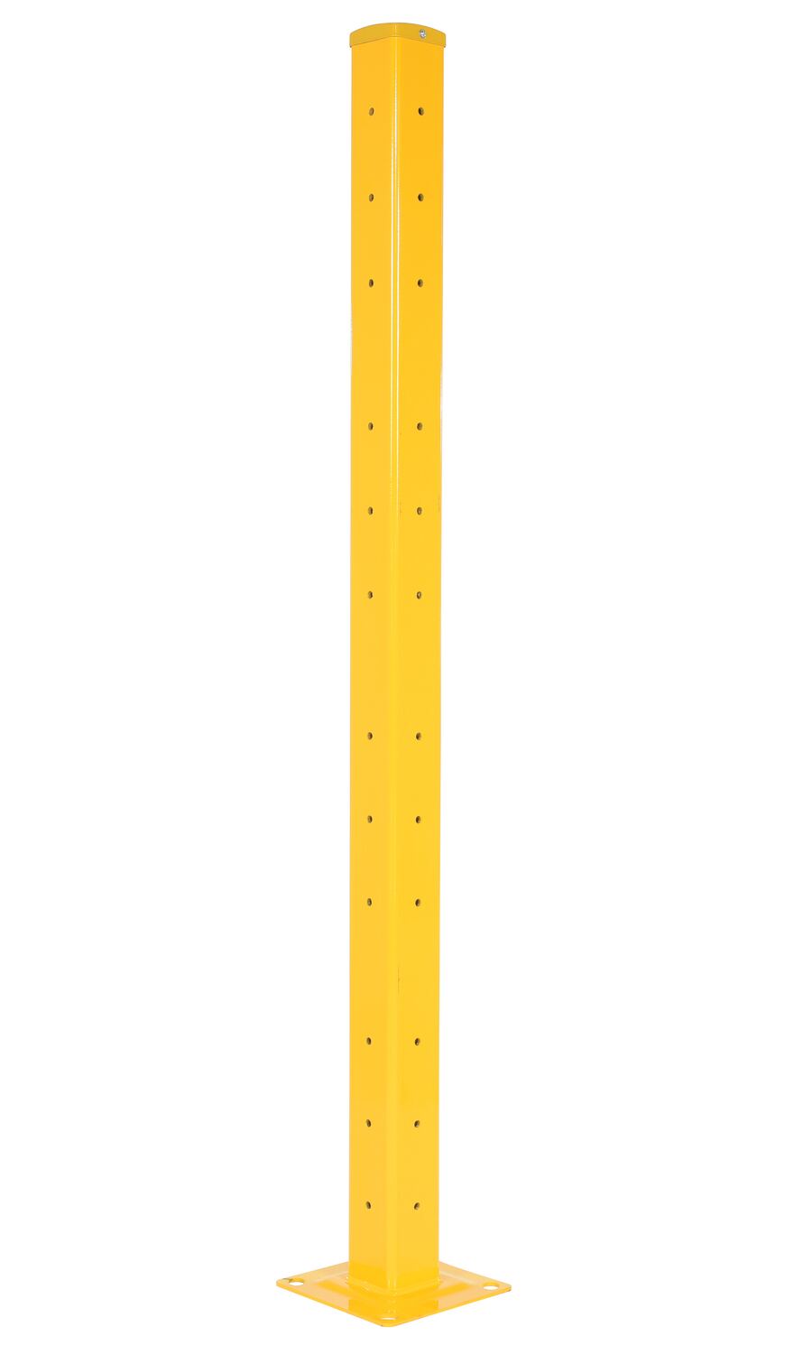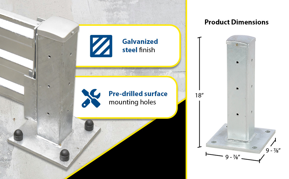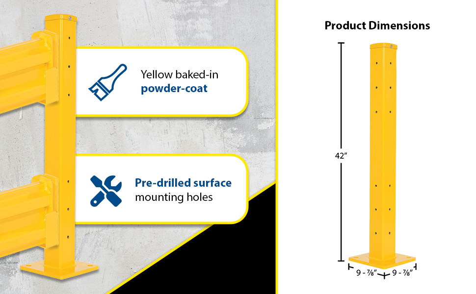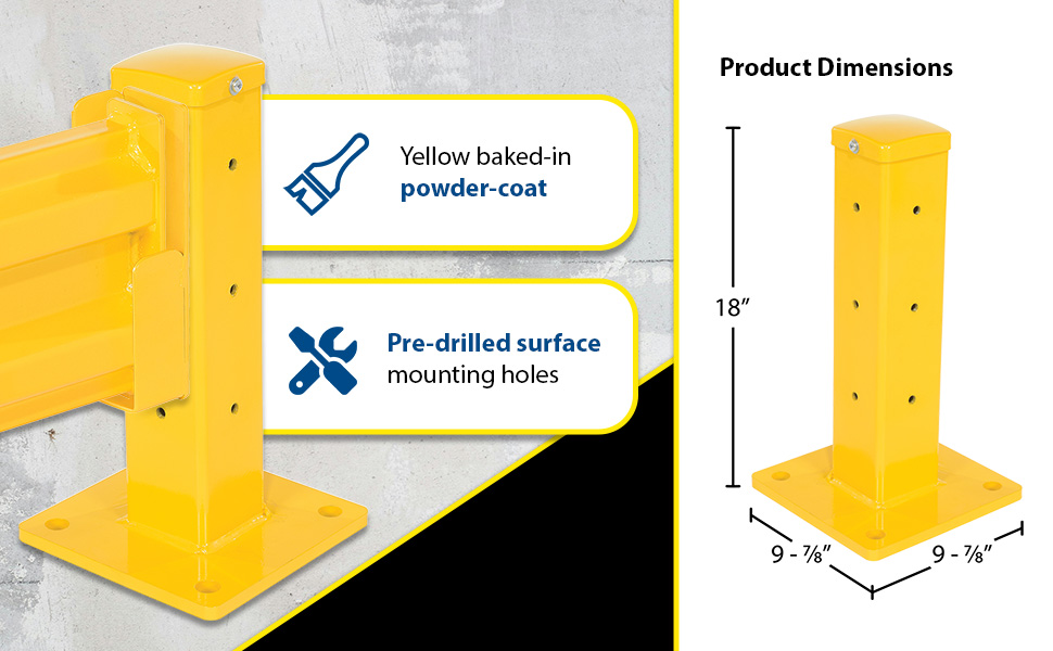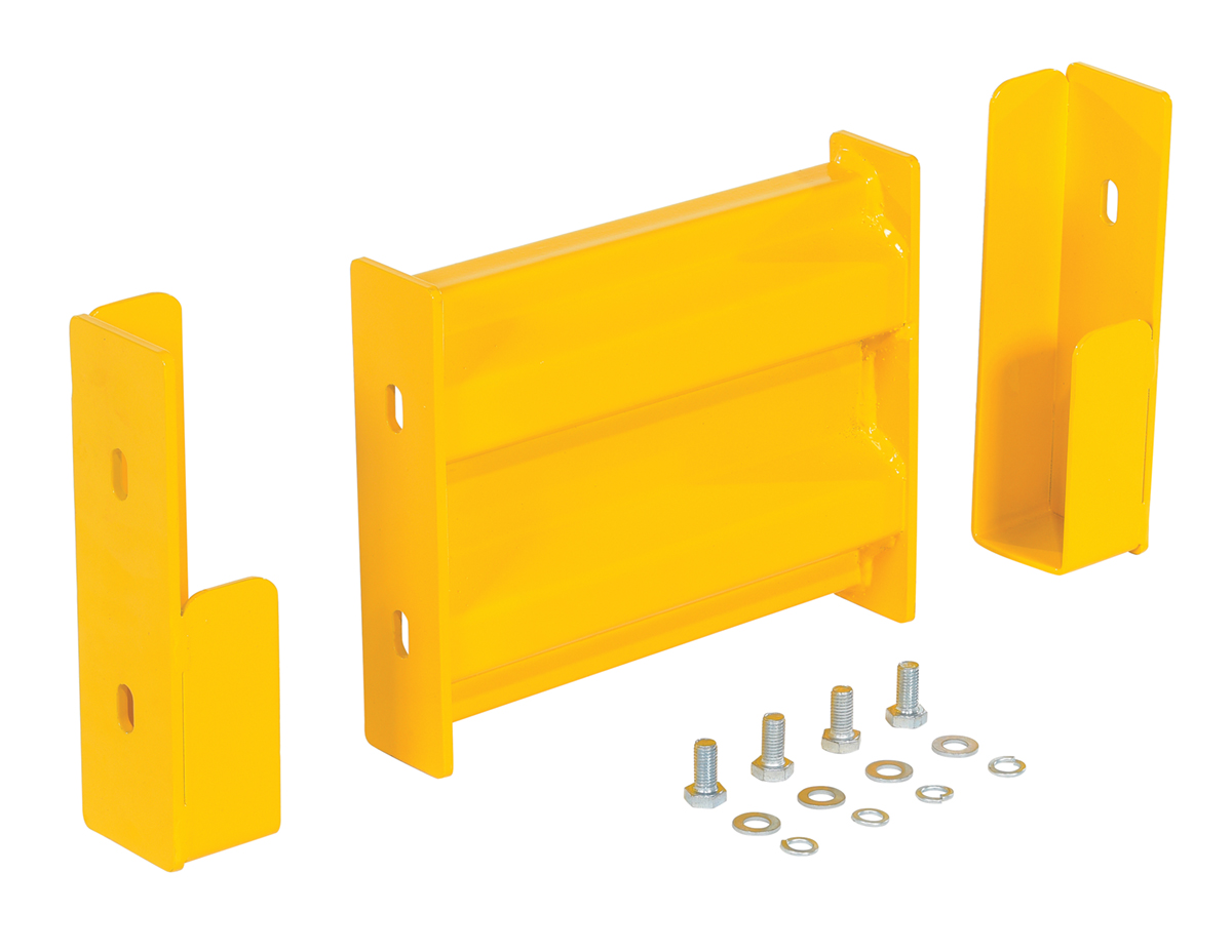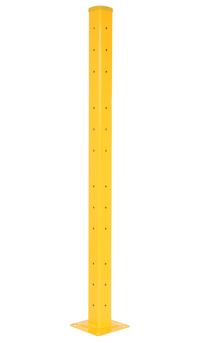 Create a modular system to protect equipment, inventory, and individuals from damage or injury with this highly visible powder coat yellow Structural Guard Rail. Triple ridge corrugated rails are constructed from 1/8" thick material, made for high impact resistance indoors or out. Posts are constructed of round corner 1/4" thick material. The steel base plate measures 10" square and is 5/8" thick. Bolts and washers are provided with individual rail sections. Concrete mounting kit is available separately. Provide a strong barrier with easy accessibility with our Drop-In Style rails. Slide rail sections into post saddles for simple assembly. Each Drop-In Style rail section includes two brackets. Bolt-On Style rails are designed for permanent installation. Models GR-TP-YL and GR-TP-GAL posts include mounting holes on all four sides for use in corners or center posts.