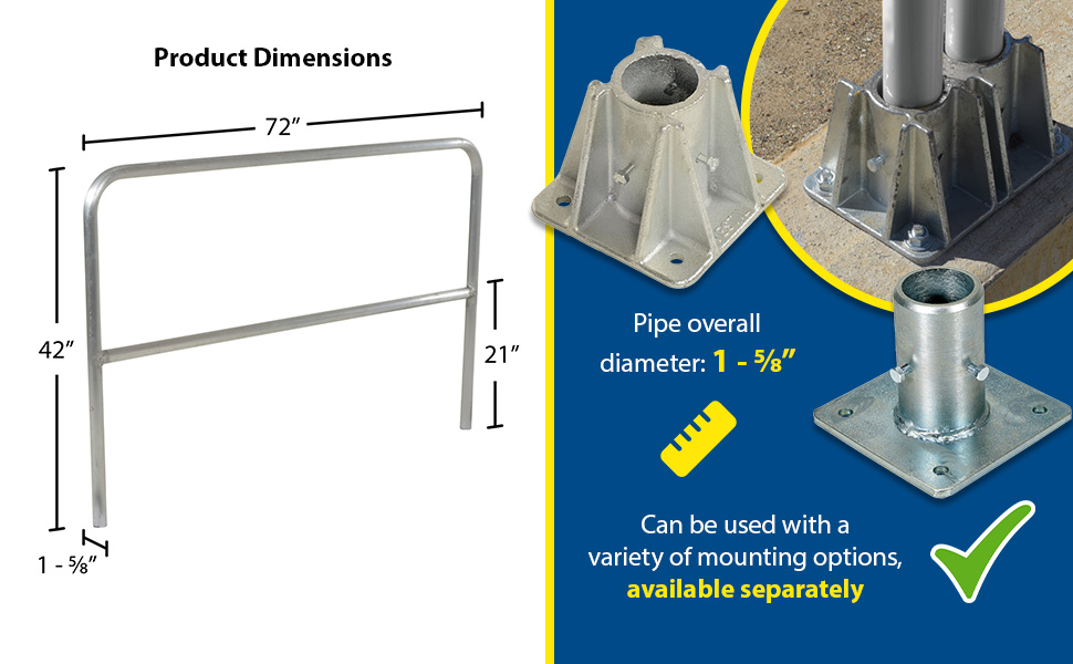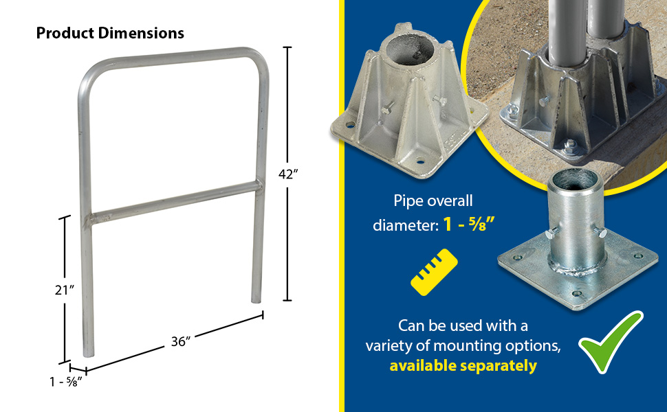 Protect people from uneven walkways and mezzanine drop-off's. The safety railing is constructed of schedule 40 aluminum. All models have an outside pipe diameter of 1-5/8". Handrails are 42" high with a 21" mid-rail. Mounting options include socket sleeves, cast steel base, barricade base, or cast steel sockets for convenient handrail removal. The cast steel sockets accept 2" x 4" or 2" x 6" wood when toe boards are required. Two (2) lag down holes are pre-drilled for permanently mounting the railing. The aluminum models are available in a variety of colors. Add one of the abbreviations, found in the below table, to the end of the model number of your choice to designate the desired color. The ADKR series safety rail products comply with U.S. Occupational Safety and Health Administration (OSHA) General Industry requirements for guardrail systems in 29 CFR 1910.29.