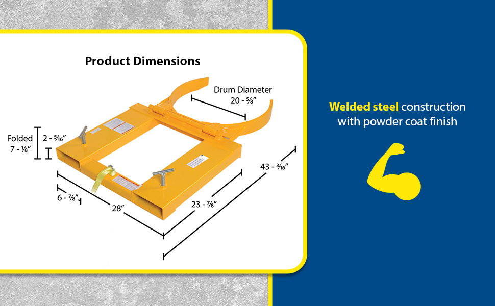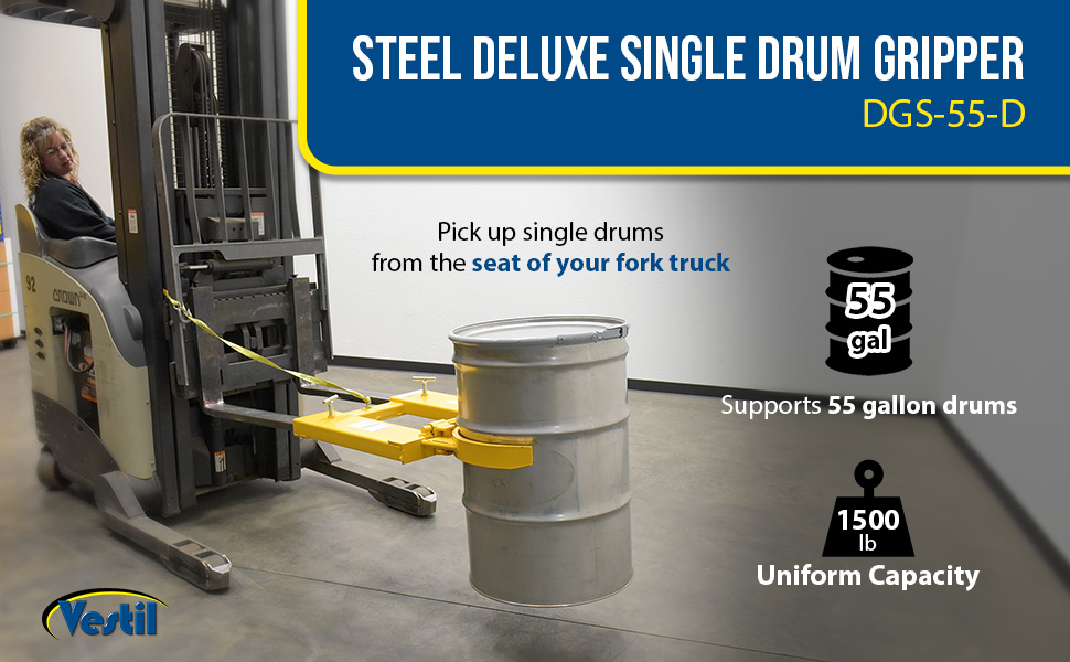 DGS-55-D DGS-55-DSteel Deluxe Single Drum Gripper 55 Gallon 43-3/16 In x 28 In x 7-1/8 In 1500 Lb. Capacity YellowUniform Capacity (lb.): 1,500