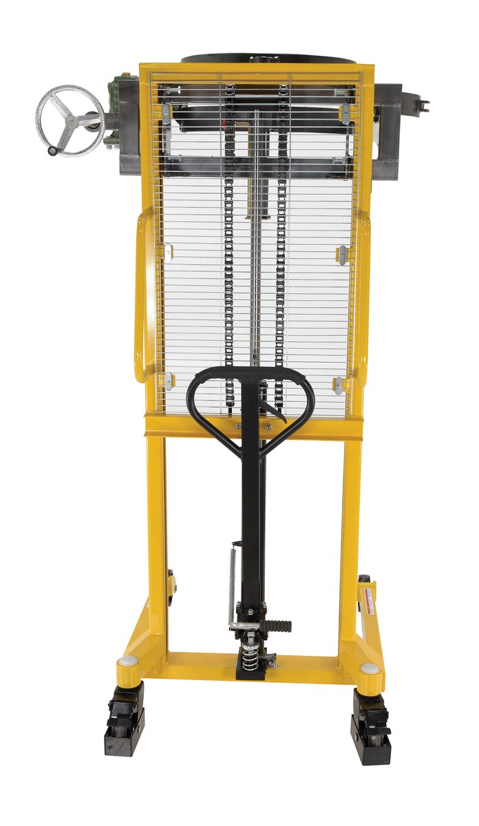 Easy to lift, transport and tilt 55 gallon steel drums. Ideal for use in warehouse environments when moving drums to and from racks. Drums can be locked in a vertical position to avoid spills or a horizontal position for draining through a faucet. A manual hand crank allows the drum to tilt up to 120 degrees. Vertically raise the drums up to 53" with a manual hand or foot pump operation. Horizontal dump height is 58" from floor to bottom of drum.