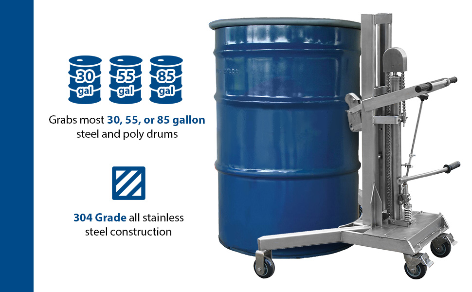 The Stainless steel hydraulic drum lifter is designed to allow the operator to load or unload drums on and off the corner of pallets. Straddle leg design allows the drum lifter to glide over standard pallets and grab most 30, 55, or 85 gallon steel and poly drums. Drums are raised and lowered easily using the foot pump. 304 grade all stainless steel construction. Ideal for washdown, pharmaceutical, and clean room applications. Highly maneuverable on two (2) rigid and two (2) swivel with brake nylon wheels. Cannot be used with fiber drums.