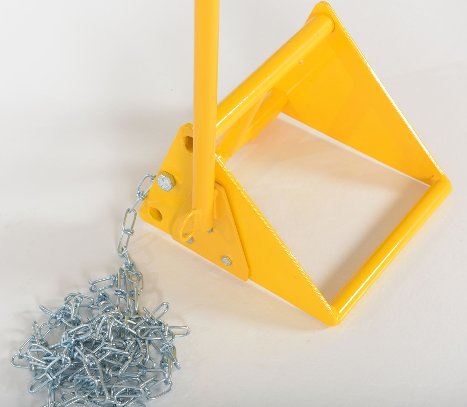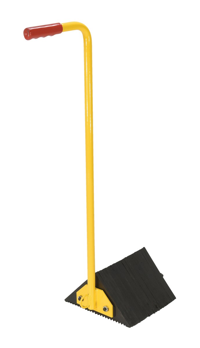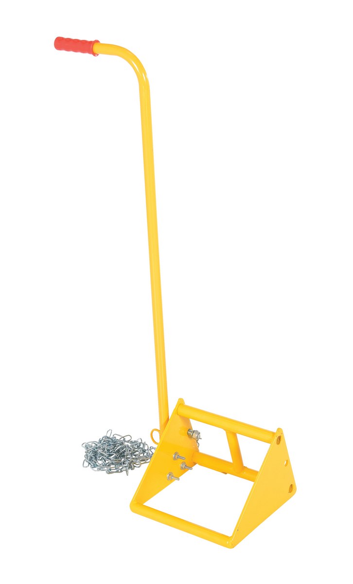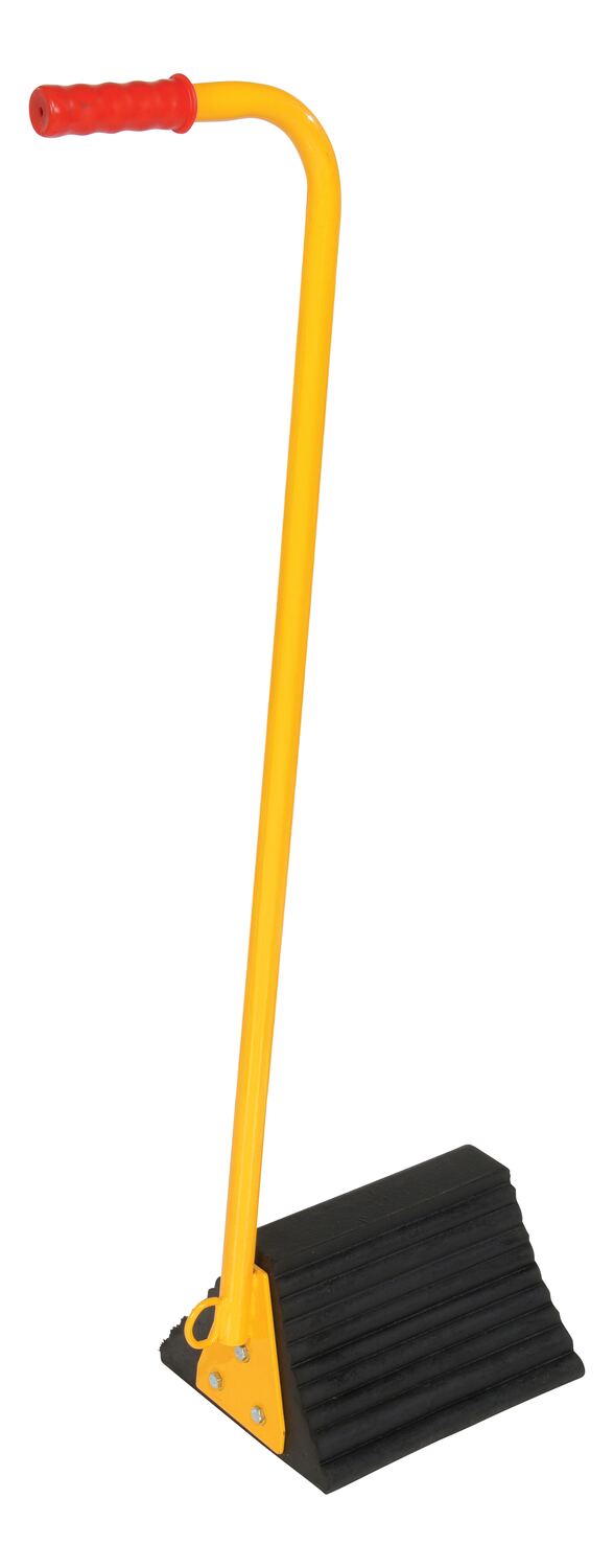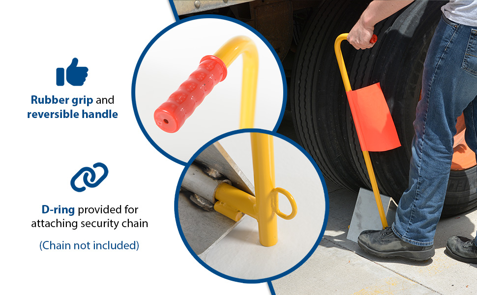 Ergonomically designed to make it easy to move wheel chocks in and out of position under trailer wheels. Reduce the risk of back, knee, and foot injuries. Handle is constructed of steel and includes a yellow baked-in powder-coated toughness. D-Ring provided for attaching security chain (chain not included.) Assembly required.