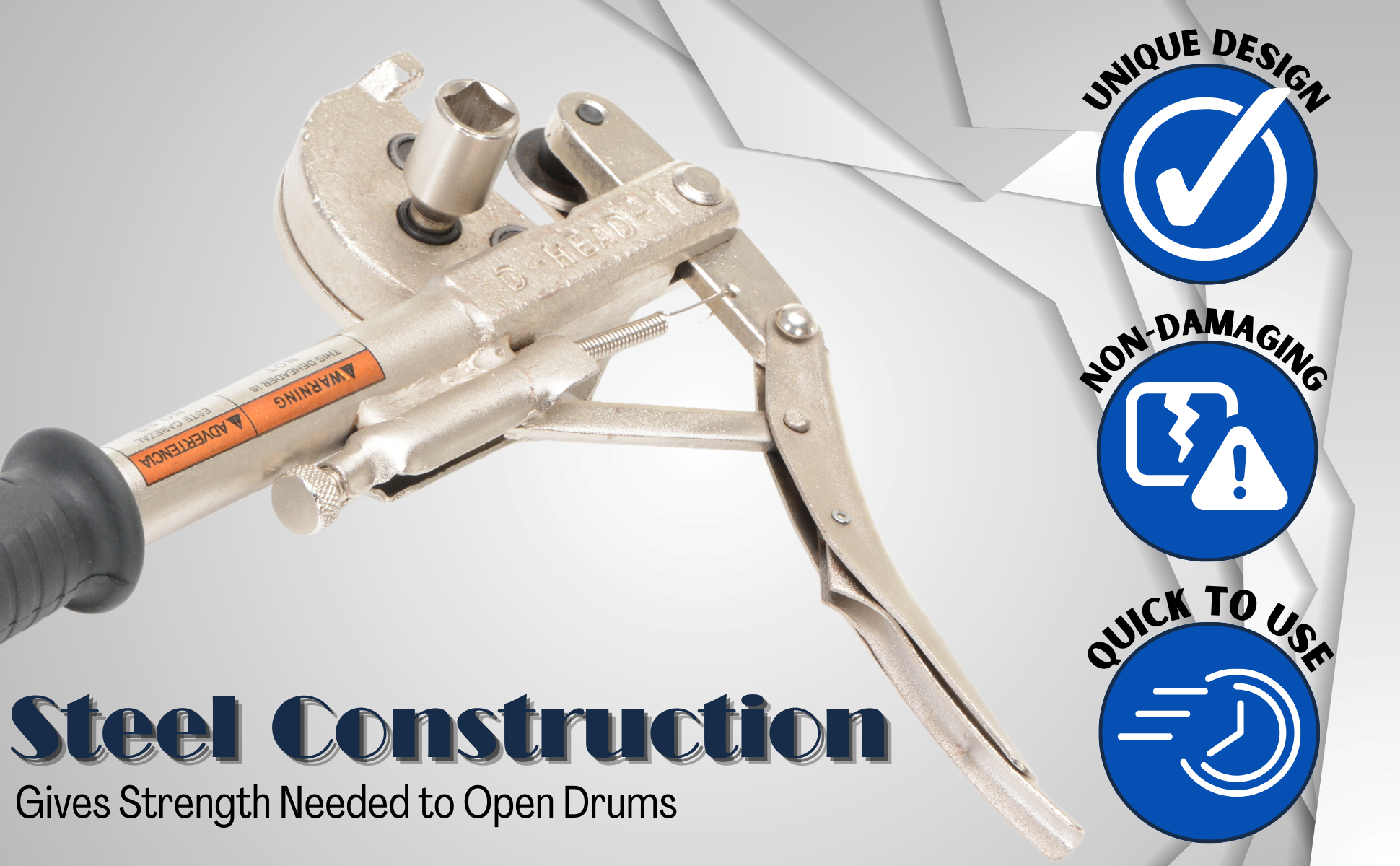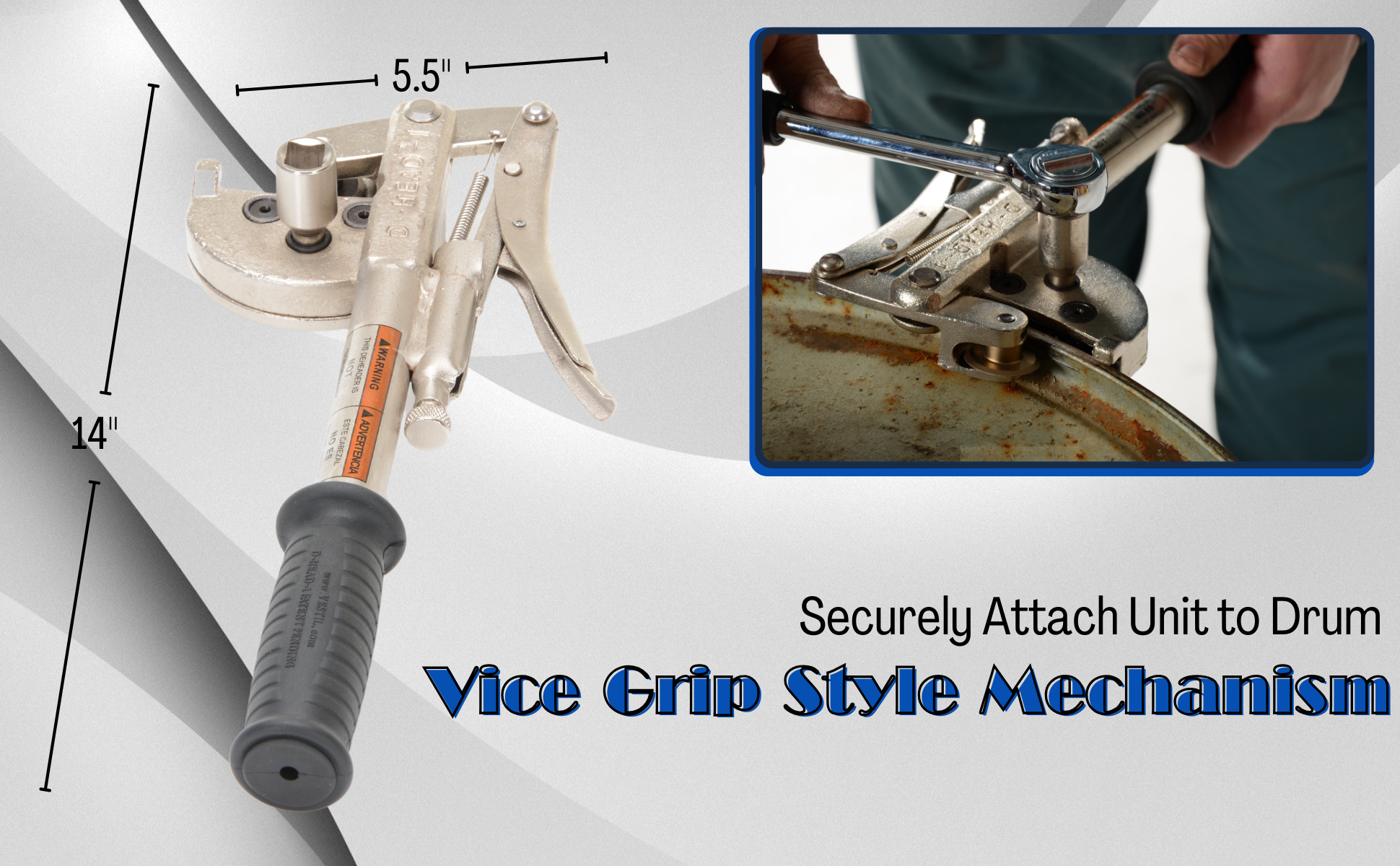 Quickly remove the head of a steel drum with our Express-Open Drum Deheader. Unique design, model D-HEAD-1, is similar to a household can-opener and is very easy to use. Includes vice-grip style mechanism for securely attaching unit to drum. Inside cutting blade does not leave a sharp edge on the drum. ONLY use either a 1/2" manual ratchet wrench or electric drill to operate the deheader ratchet (ratchet drive not included).