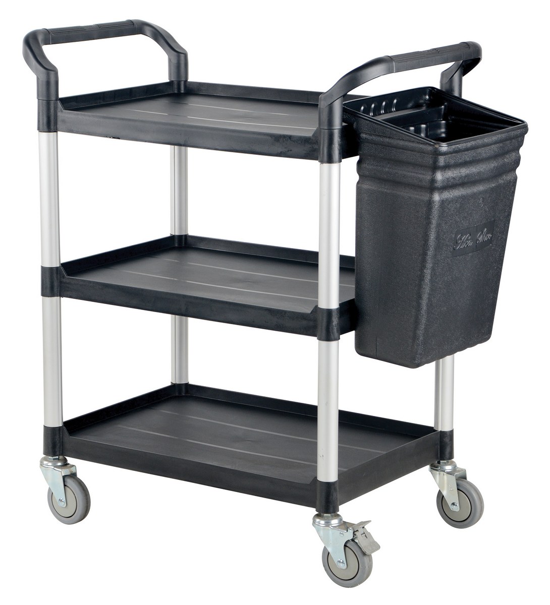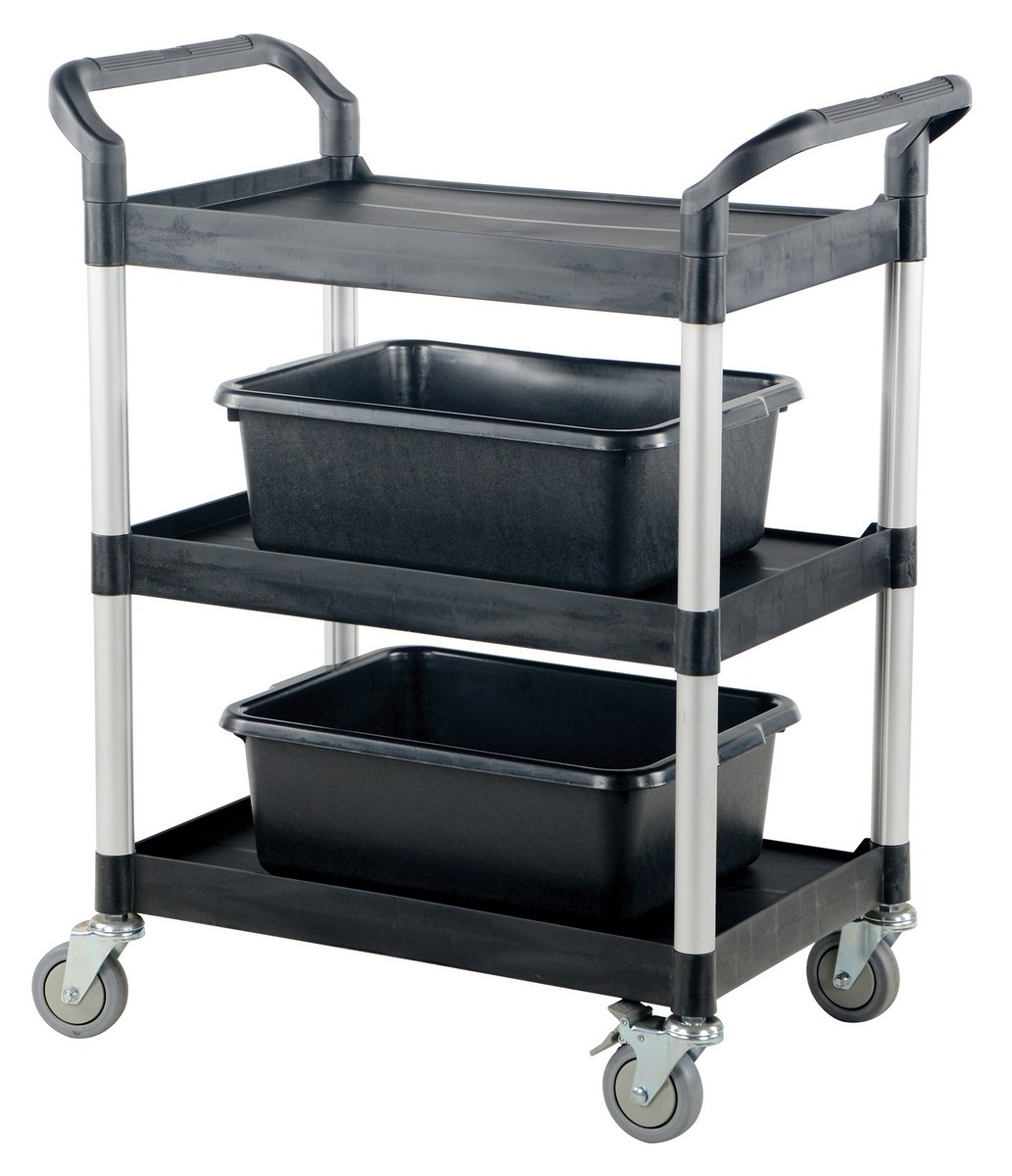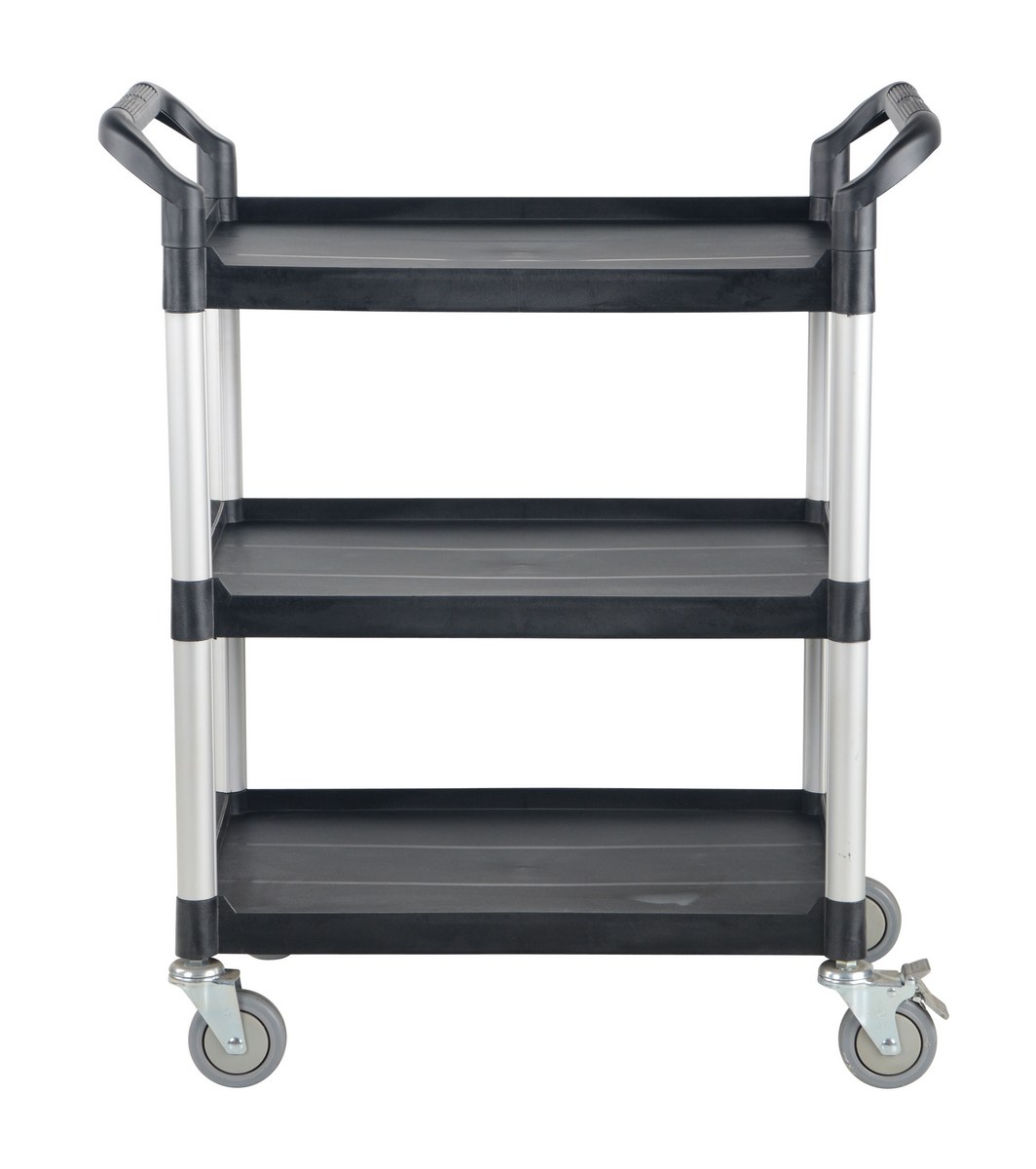 The food and service cart is ideal for the hospitality industry. The secure grip handles on the strong, yet, lightweight frame makes for easy maneuverability, while the low noise thermoplastic casters make transportation as quiet as possible. The steel constructed panels and slider drawer protects material from outside harm as well as accidental falling. Additionally, the semi-textured surface with perimeter lip prevents sliding of products while still being easily cleanable.