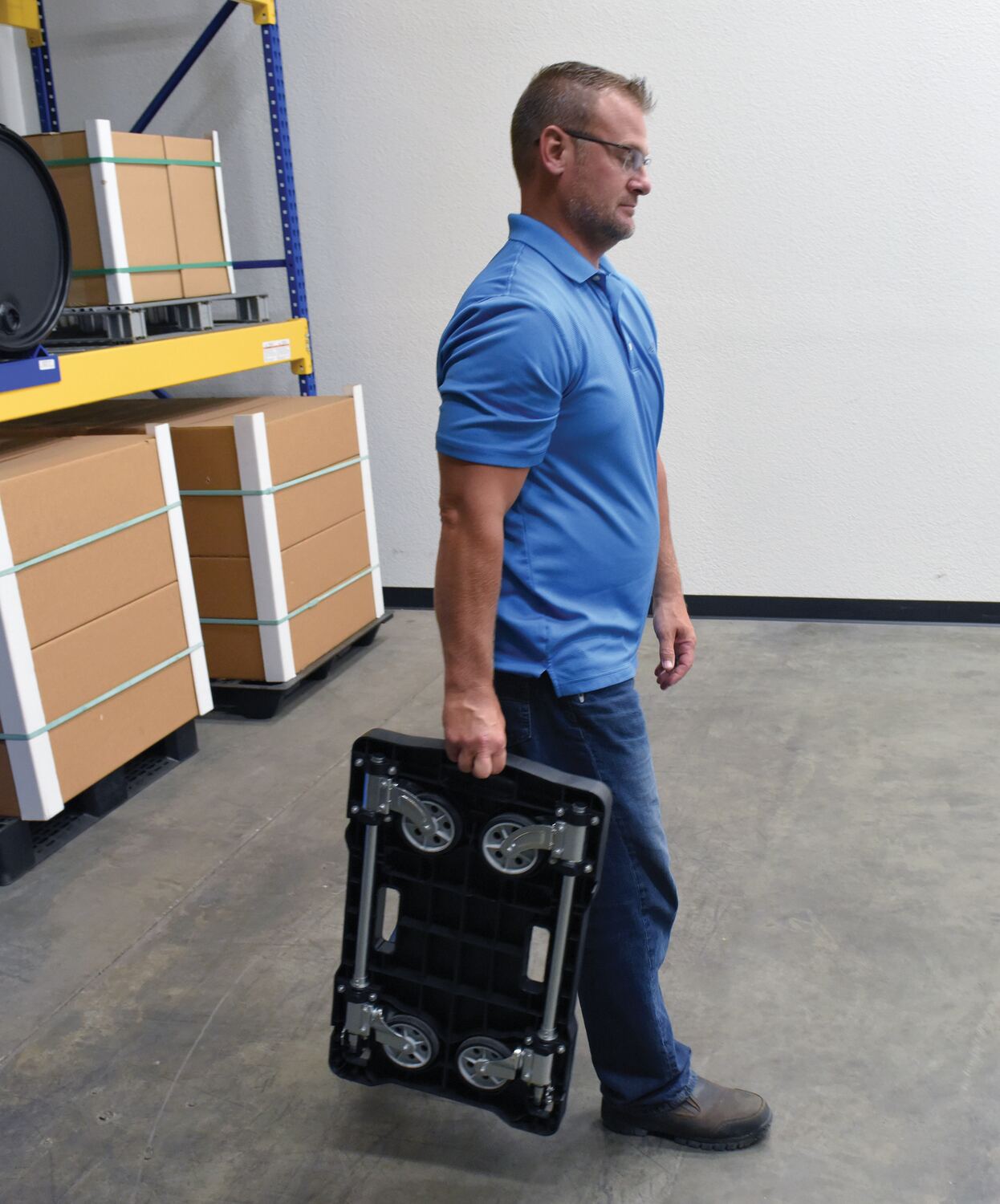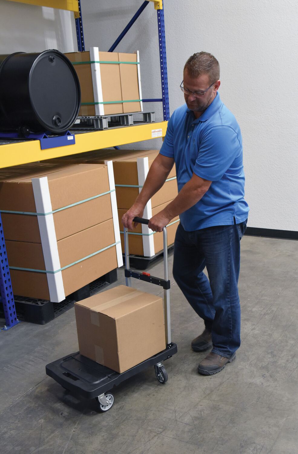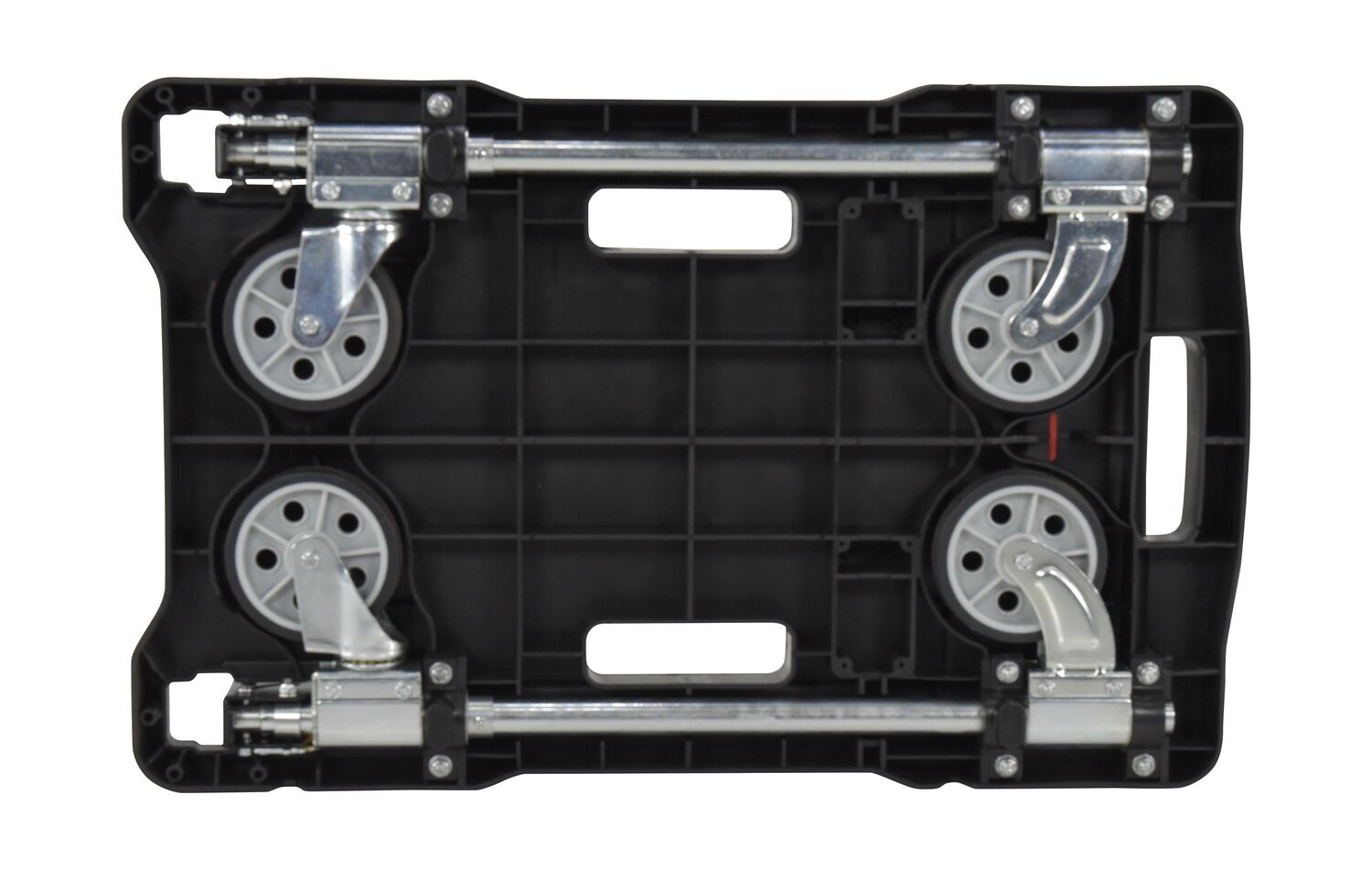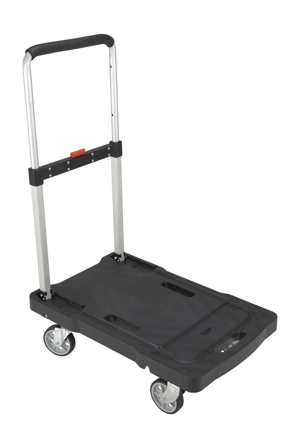 Unique cart folds completely flat for storage - telescopic handle folds down and casters fold up. Handle is adjustable to three different heights and features a cushion grip for comfort. Deck includes non-slip rubber grips and hand holes for easy carrying. Carts roll on two rigid and two swivel poly casters. Cart is constructed from plastic, steel and aluminum components.