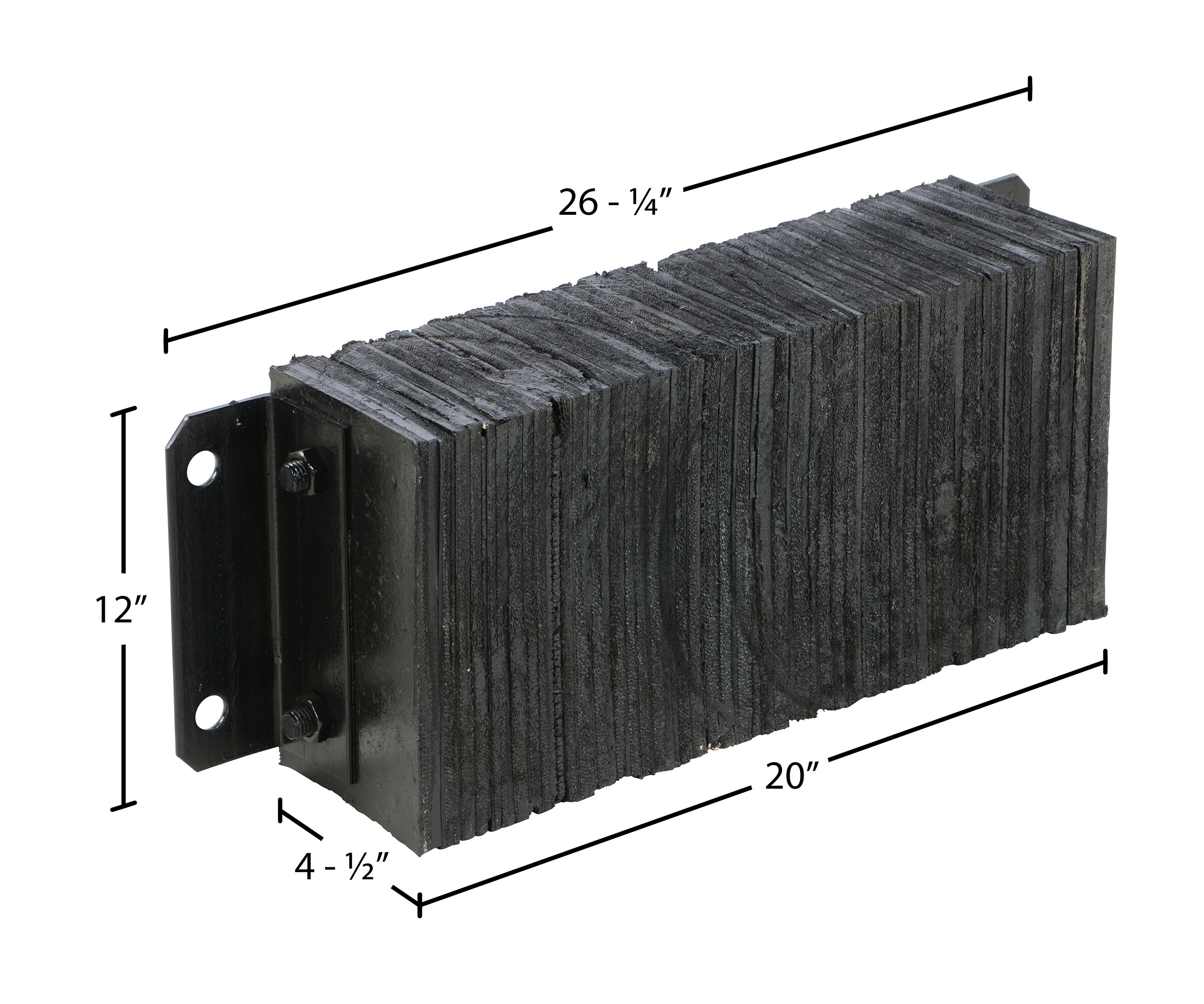 The laminated Dock Bumper provides durable, economical protection for loading docks and trailers. This unit is constructed of fabric reinforced rubber from recycled truck tires. The pads are laminated between painted structural angles and held together with steel tie rods. The width is bolt hole center to bolt hole center. Installation hardware sold separately.