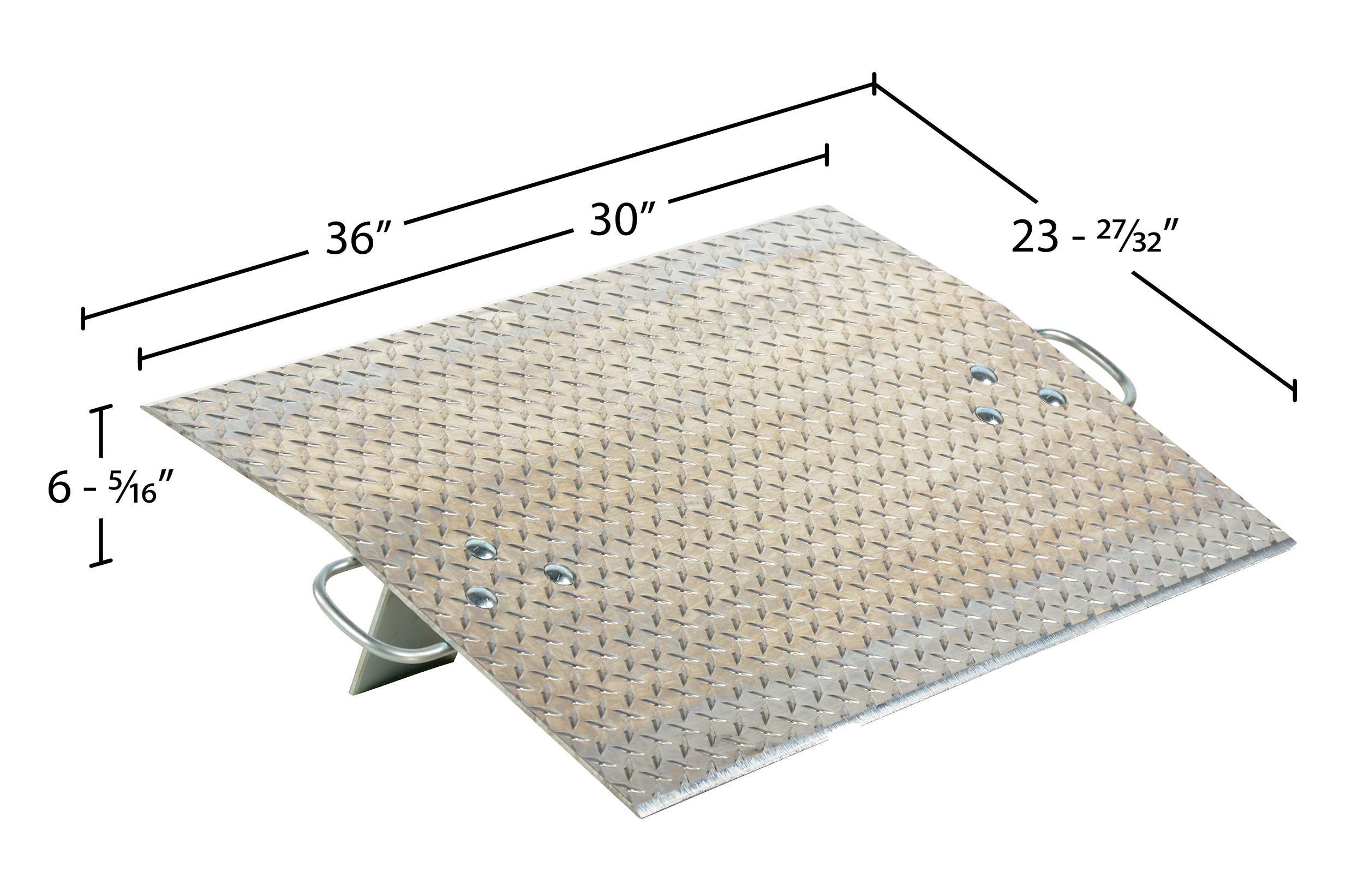 Aluminum Hand Truck Dock Plate 30 In. x 24 In. 700 Lb. Capacity SilverThis Aluminum Hand Truck dock plate is designed for use with two (2) wheel hand trucks. It is a convenient, safe, and easy way to access loading docks from trucks. This dock plate is lightweight and easily transported by just one person. The tread plate surface ensures skid-resistant safe traction and the locking legs secure the plate for safe loading and unloading. Complete with bolt-on zinc plated carrying handles and locking legs.