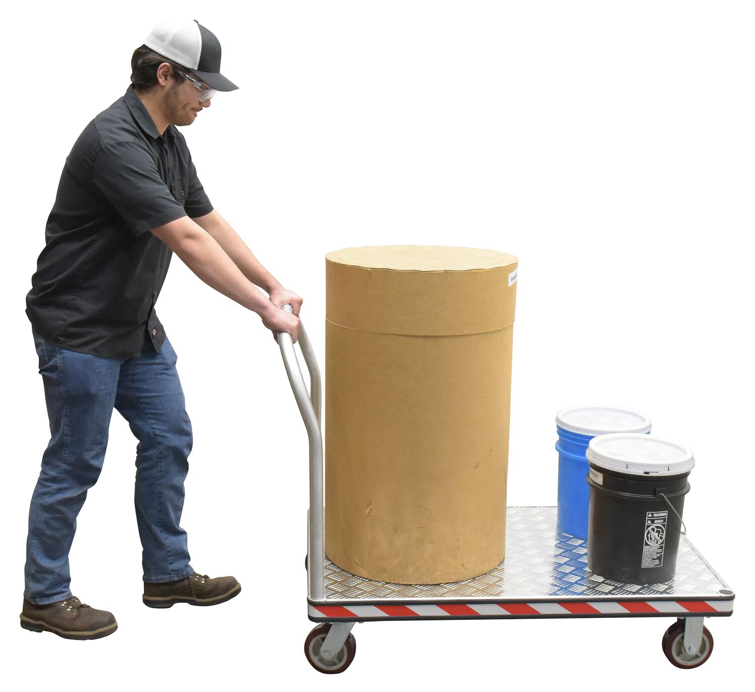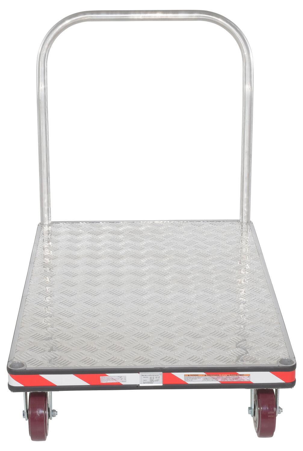 An aluminum tread plate platform truck is a great addition a variety of settings. Fitted with non-marking rubber protective buffer strip to protect walls and door frames during transit. Design allows items to be loaded and unloaded from multiple sides. The poly-on-poly casters roll smoothly over surfaces.