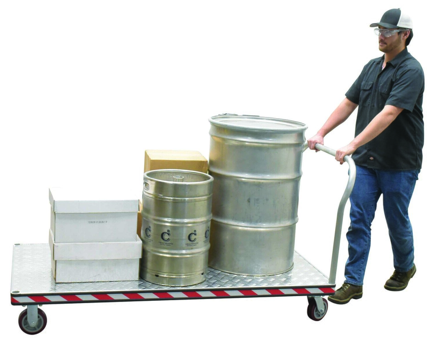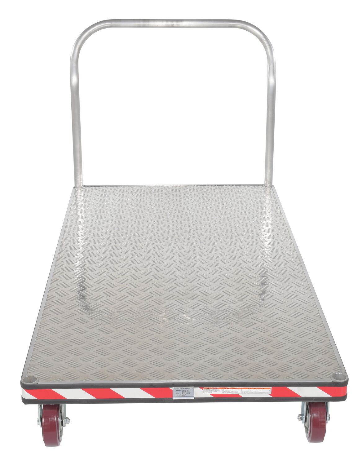 An aluminum tread plate platform truck is a great addition a variety of settings. Fitted with non-marking rubber protective buffer strip to protect walls and door frames during transit. Design allows items to be loaded and unloaded from multiple sides. The poly-on-poly casters roll smoothly over surfaces.