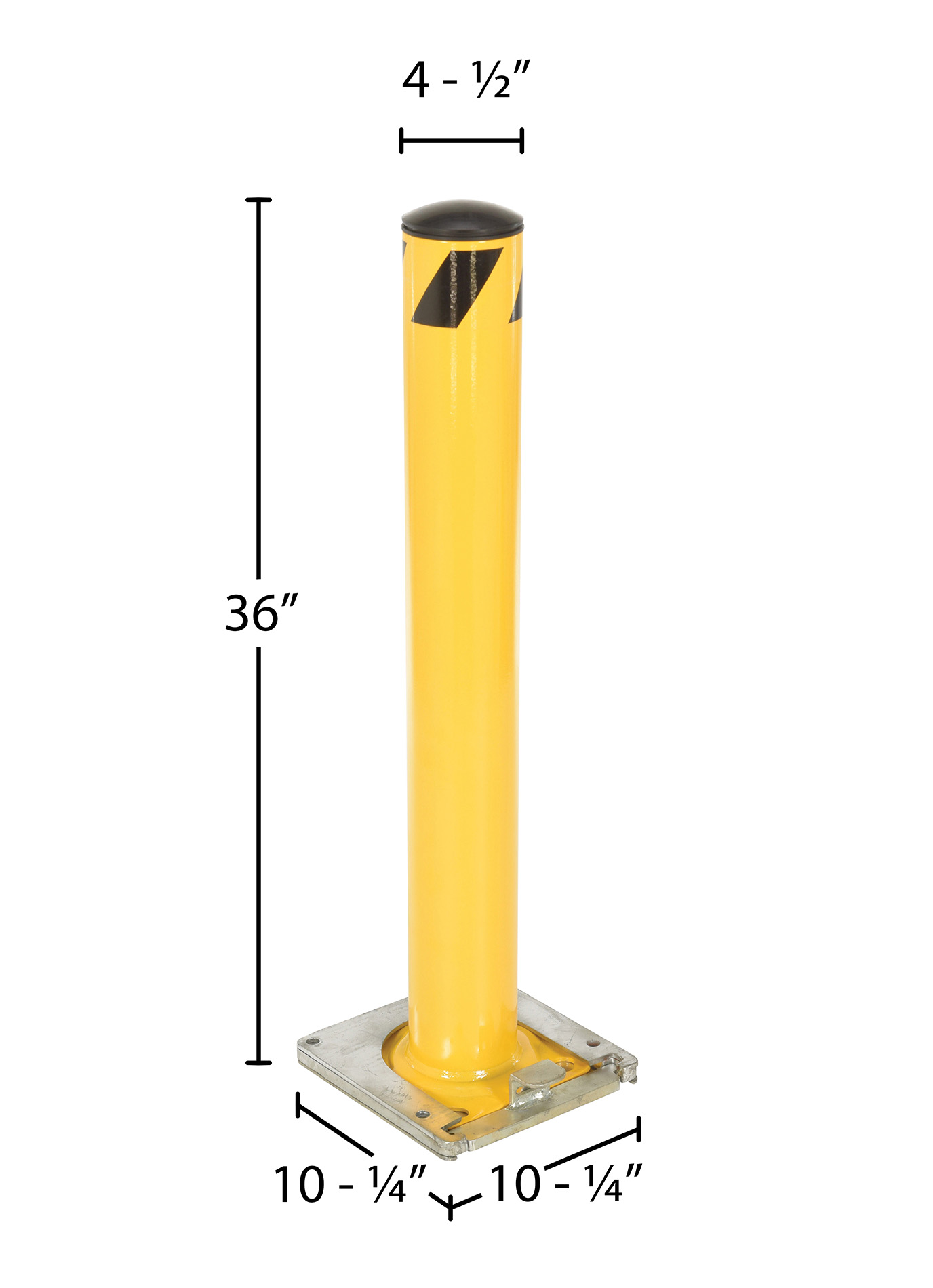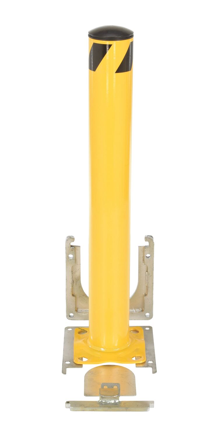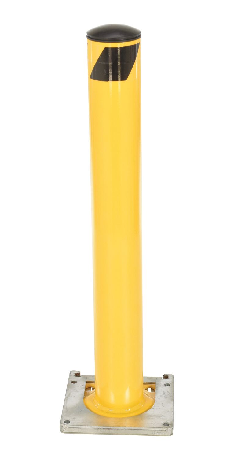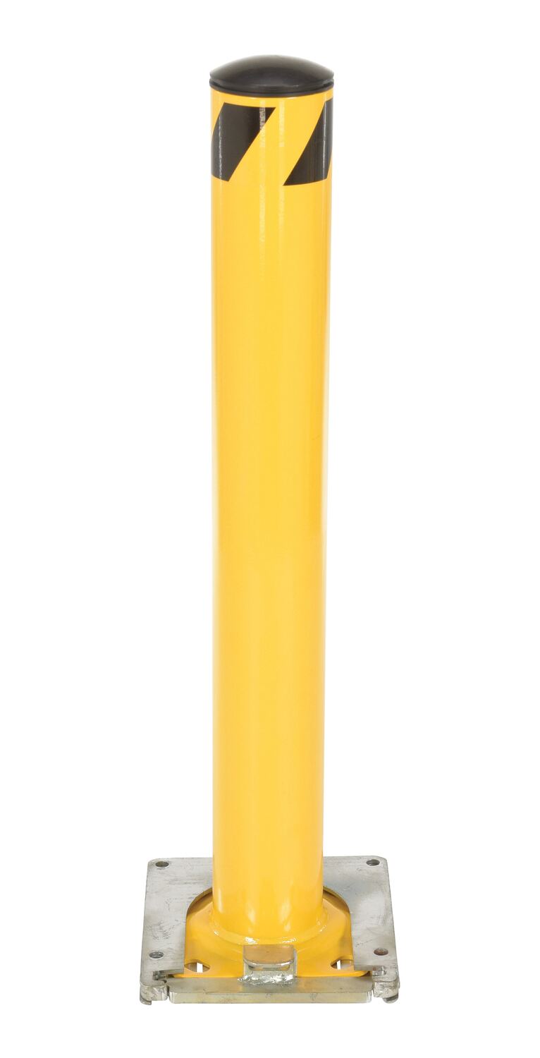 This steel pipe safety bollard can be used both indoors and outdoors to protect work areas, racking and personnel. Surface mounted steel base plate allows for quick and easy bollard removal. Steel base plate is bolted in place. Guard is easily inserted into base plate then locked in place. Base plate includes pre-drilled mounting holes. Plastic caps are removable. Powder coated safety yellow finish. Welded steel construction.