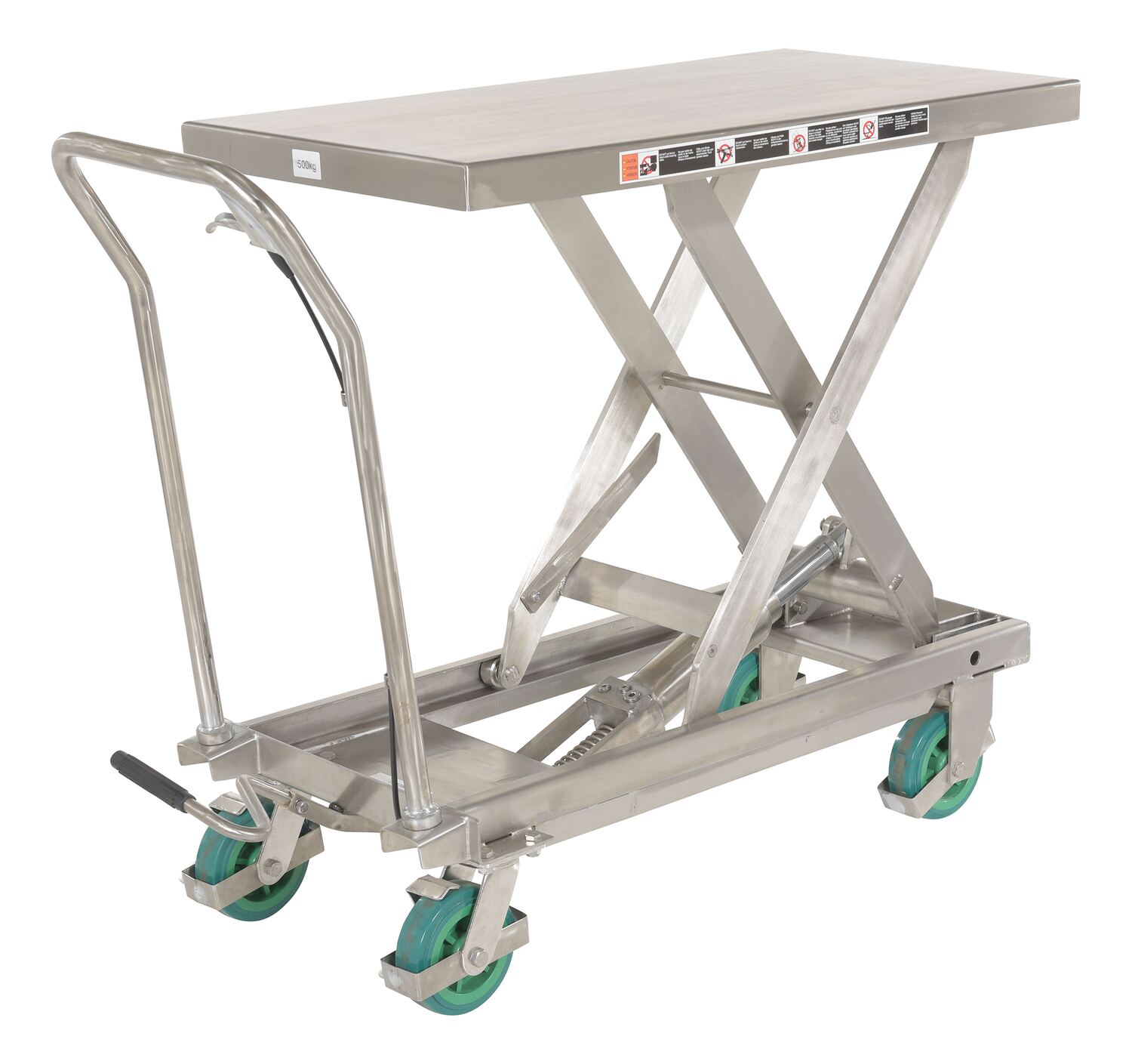 The premium scissor lift cart is constructed of heavy duty steel and designed to withstand the most demanding industrial environments. The simplicity and compactness of these products make them ideal for lifting and transporting loads, order-picking, die handling, and for use in support of assembly operations. There is little exertion required to maneuver the deck due to the high quality foot-actuated, single speed hydraulic pump for raising . A unique tilt-up table top allows for safe and easy maintenance.