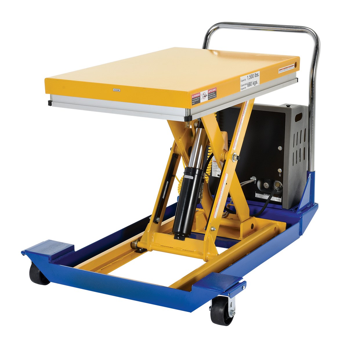 Steel DC Powered Scissor Cart 36 In. x 24 In. 1500 Lb. Capacity Blue / YellowThe DC powered Scissor Cart table provides an unparalleled support in lifting, palletizing, loading, and unloading applications. The cart is raised or lowered with a DC powered motor. The unit rolls smoothly on two rigid and two swivel phenolic casters with brakes. The internal DC powered electric motor and battery is included on DC units. The built-in battery charger is AC powered and is included. Push buttons to raise and lower lift are located on a hand control with a coil cord, which is standard. The platform is equipped with perimeter pinch-point guard for OSHA compliance. The push handle is removable. Features an internal safety velocity fuse in each cylinder.