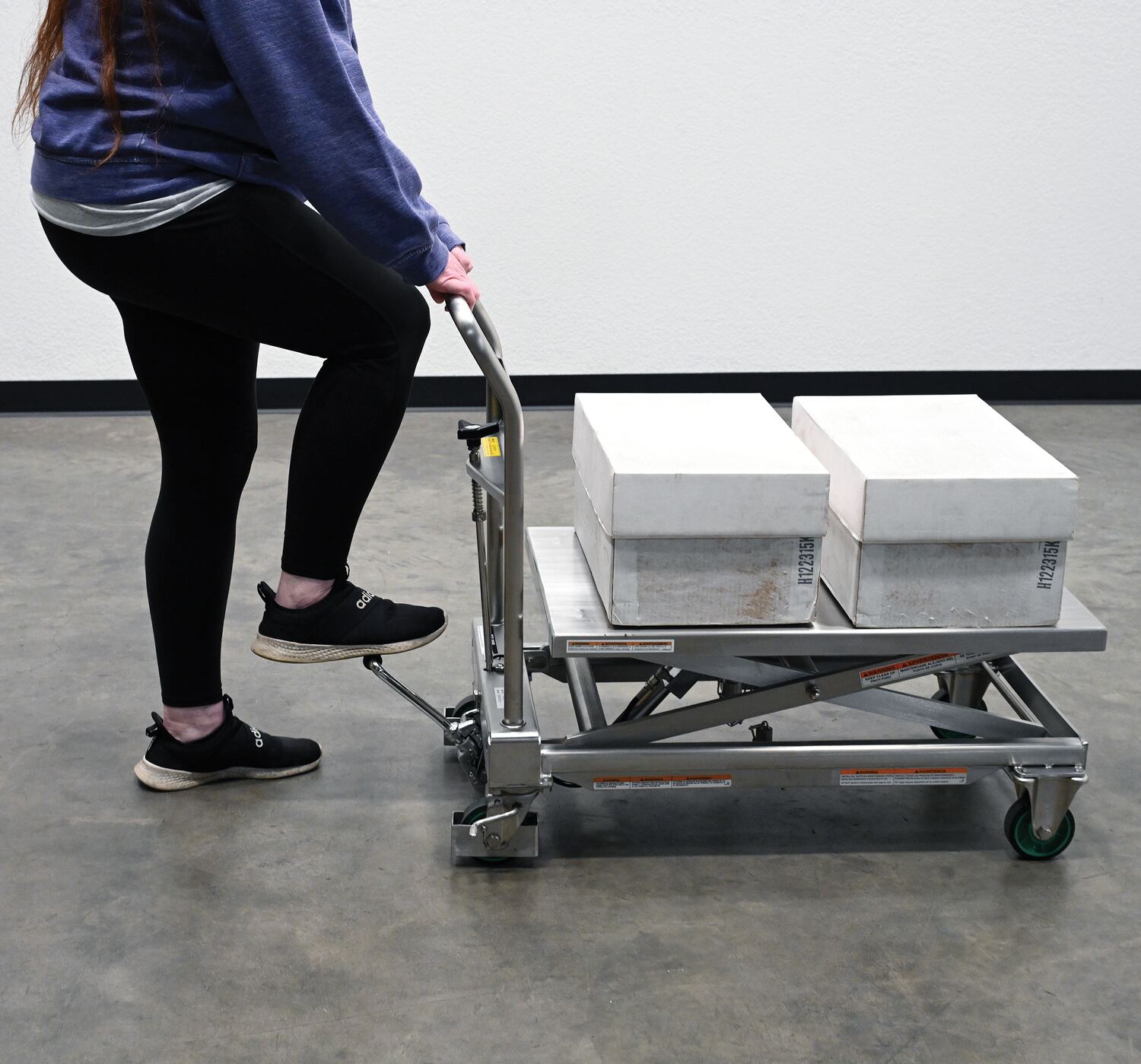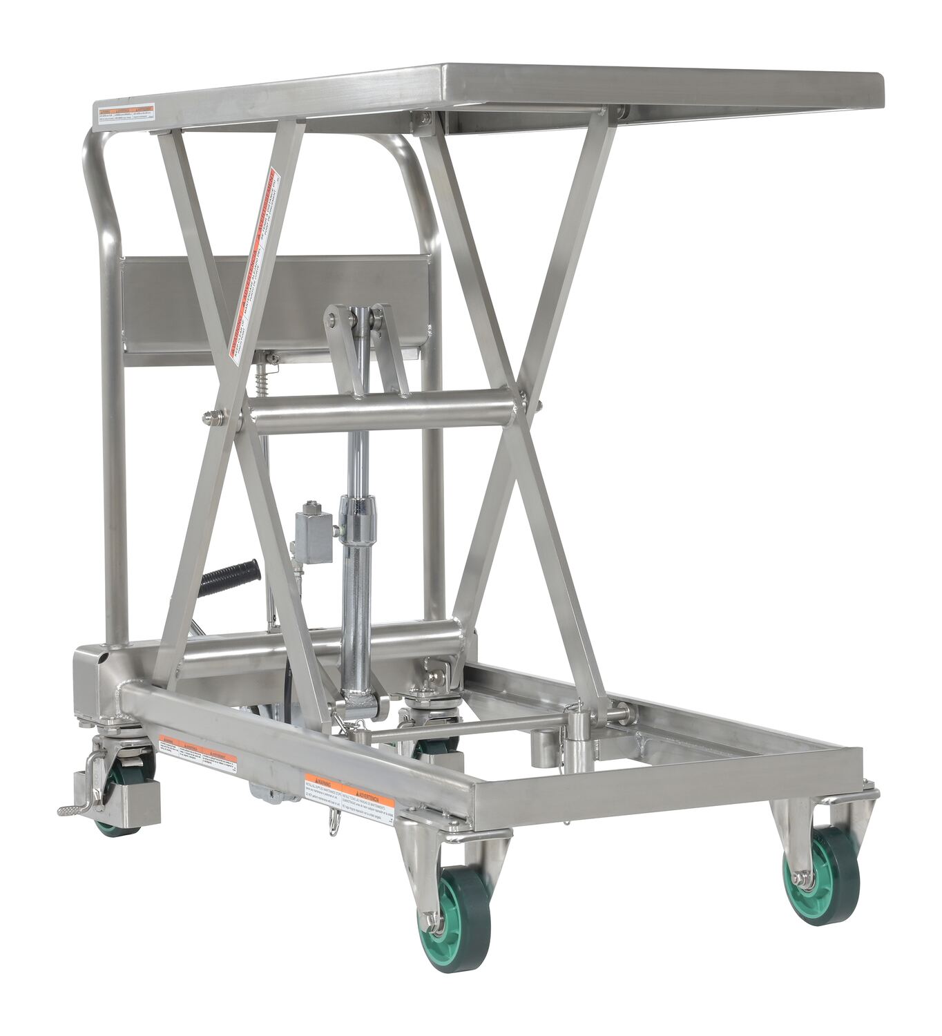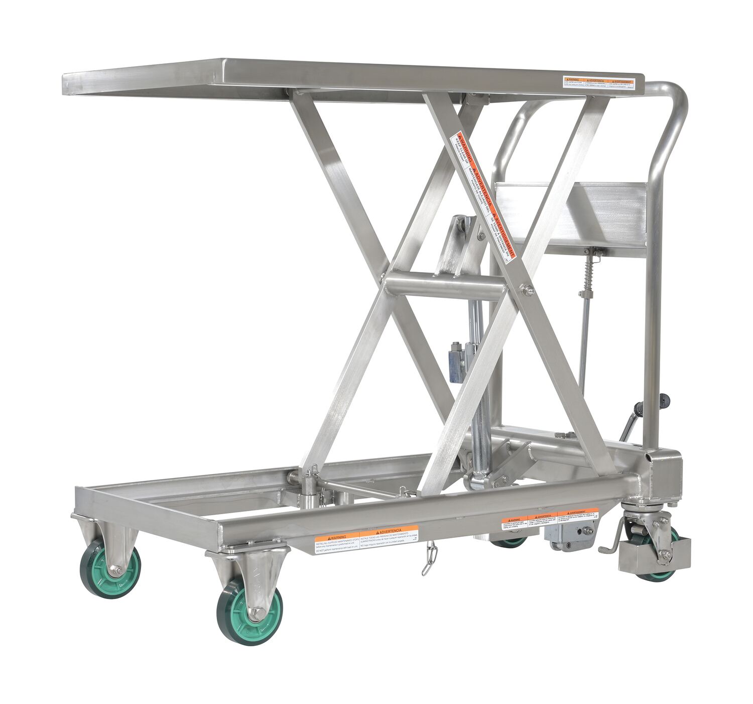 The Hydraulic elevating cart minimizes worker bending and lifting through its ergonomic design and portability. Material can be easily loaded onto a cart from a table, lowered to a safe transporting height, and raised to unload at destination. The foot pump includes a soft-lowering down valve. The unit moves easily on four polyurethane casters; two swivel with brakes and two rigid. Features a two-speed foot pump. Foot pump pedal, pump assembly and hydraulic cylinder are chrome plated. Rest of the unit is fully stainless construction. Features an internal safety velocity fuse in each cylinder.