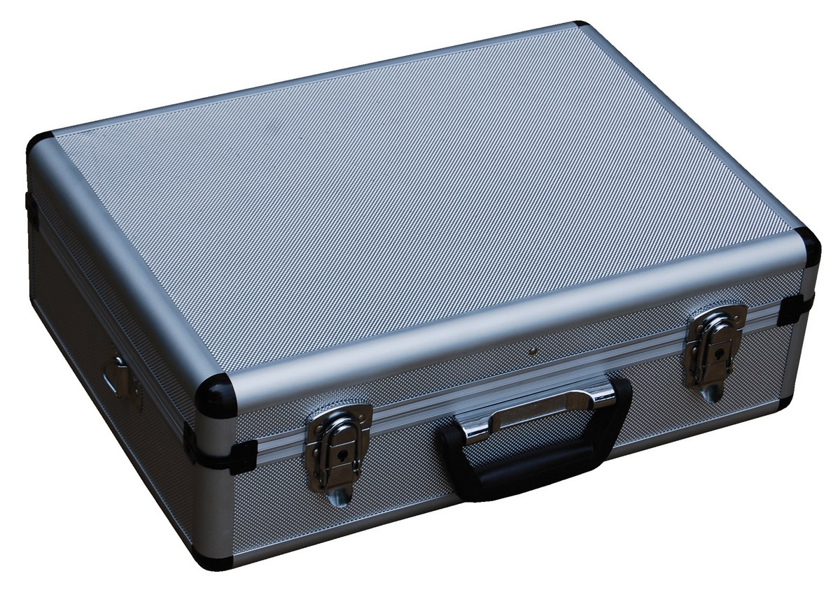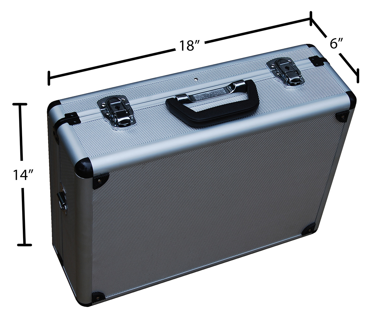 Aluminum Carrying Case 18 In. x 14 In. SilverRugged textured carrying case with rounded corners. Lid interior includes removable panel with storage pouches and sleeves. Lower storage area includes segmented walls and adjustable panels in one quarter (1/4) inch increments. Molded plastic carrying handle. Includes removable shoulder strap. Quality locking latches included with two (2) keys.