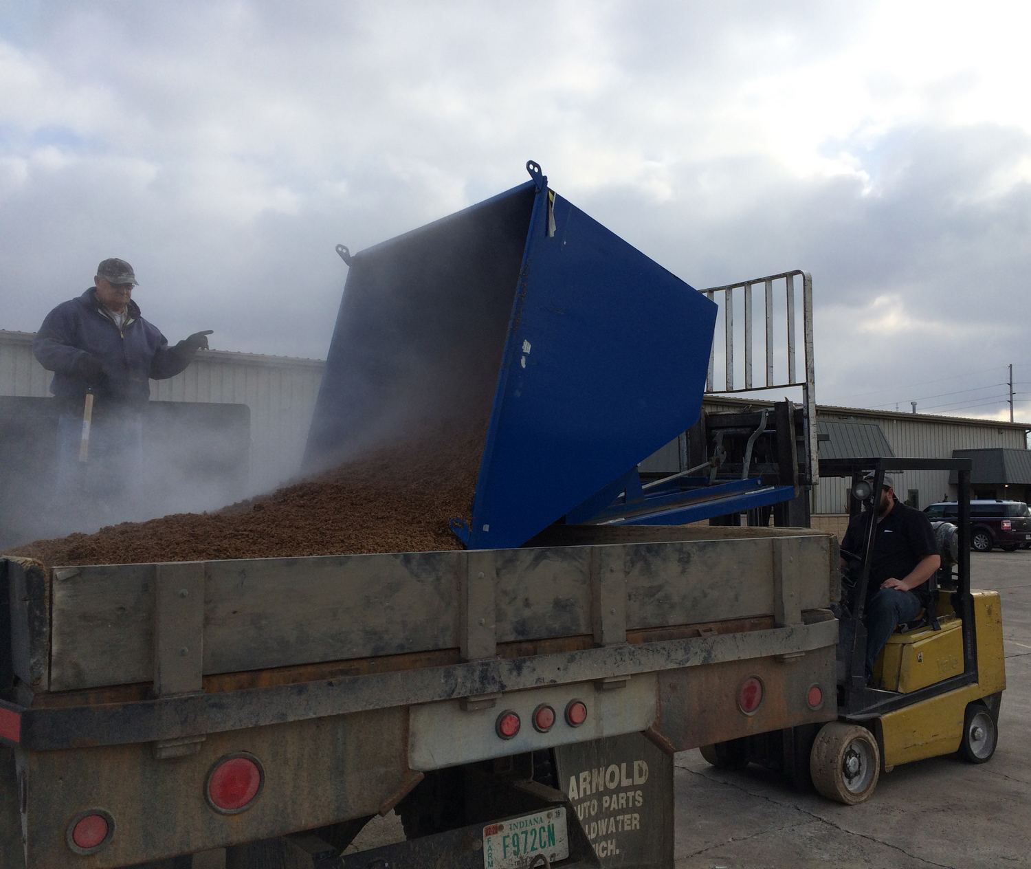 This Medium Duty self-dumping steel Hopper with bumper release automatically dumps when bumper release contacts the front of the dumpster. Hopper returns to an upright and locked position automatically after it dumps. Also includes a cable that may be operated from the seat of the fork truck to manually dump the hopper. The included safety restraint should be properly secured to a fork truck before dumping. (Length dimension is measured at top of chute.) Self-dumping hoppers facilitate compliance with OSHA general industry rule 29 CFR 1910.178(m)(5)(iii) by allowing lift truck operators to remain at the controls of their truck throughout the dumping process.
