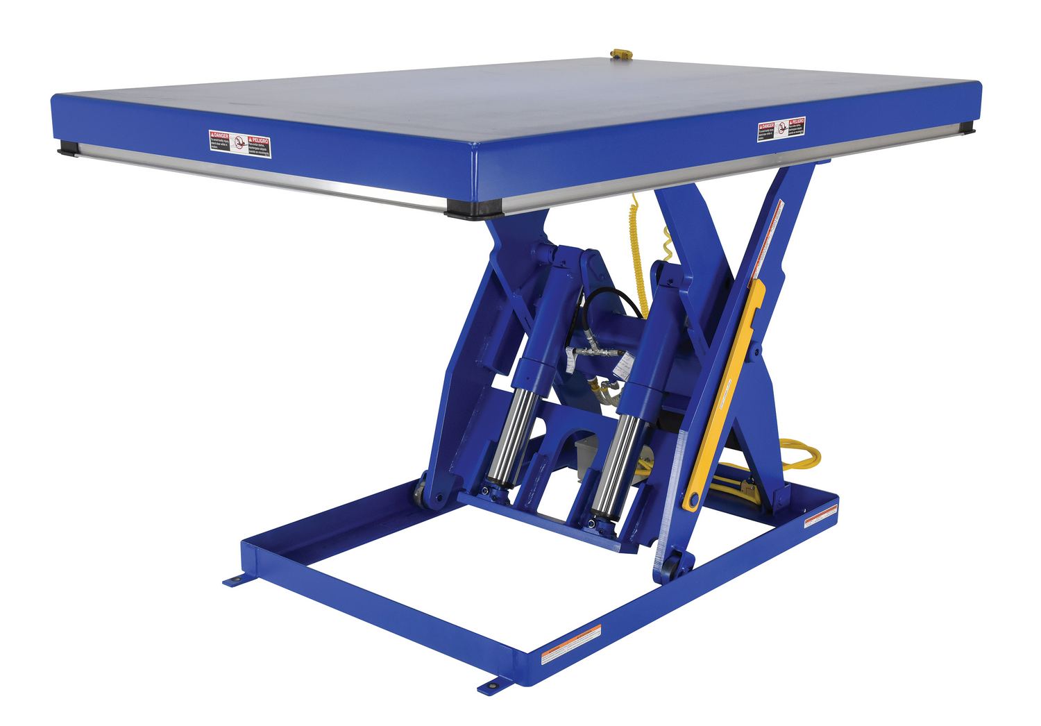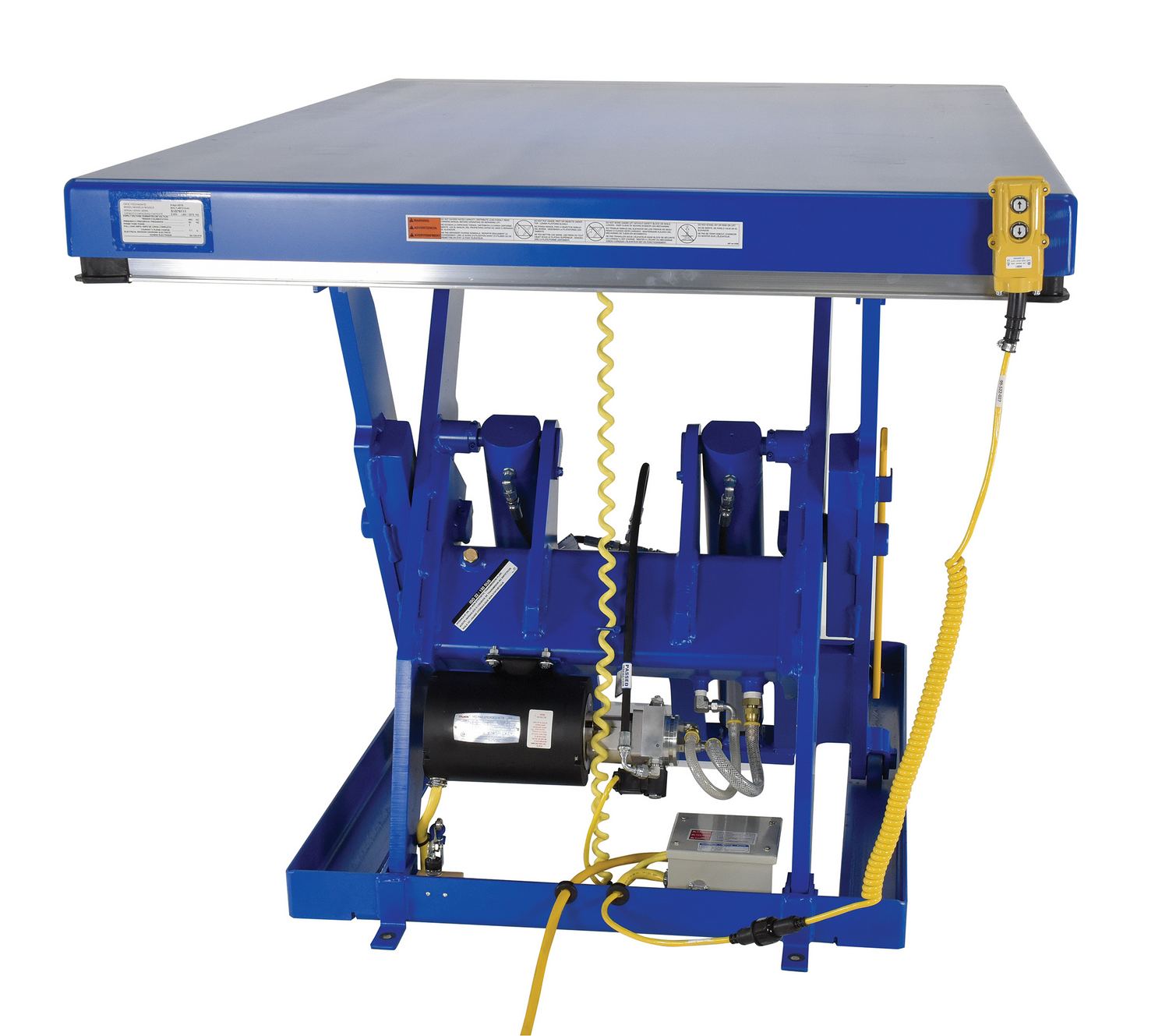 The electric hydraulic scissor lift table is used by all types of manufacturing and warehouse facilities. Safety features include a patented pinch point perimeter toe guard to protect pinch points while lowering the table, fused push button control, internal safety velocity fuse to maintain platform height in the event of hose or fitting failure, integral maintenance prop, adjustable upper travel limit switch to stop the table at maximum height, and displacement-style hydraulic cylinders for maximum strength. It also features a pressure plated pump, manifold system, and state-of-the-art lifetime lubricated bearings. The standard 56 frame electric motor is fully enclosed with additional voltage options available. Contact factory if platform dimensions are crucial.